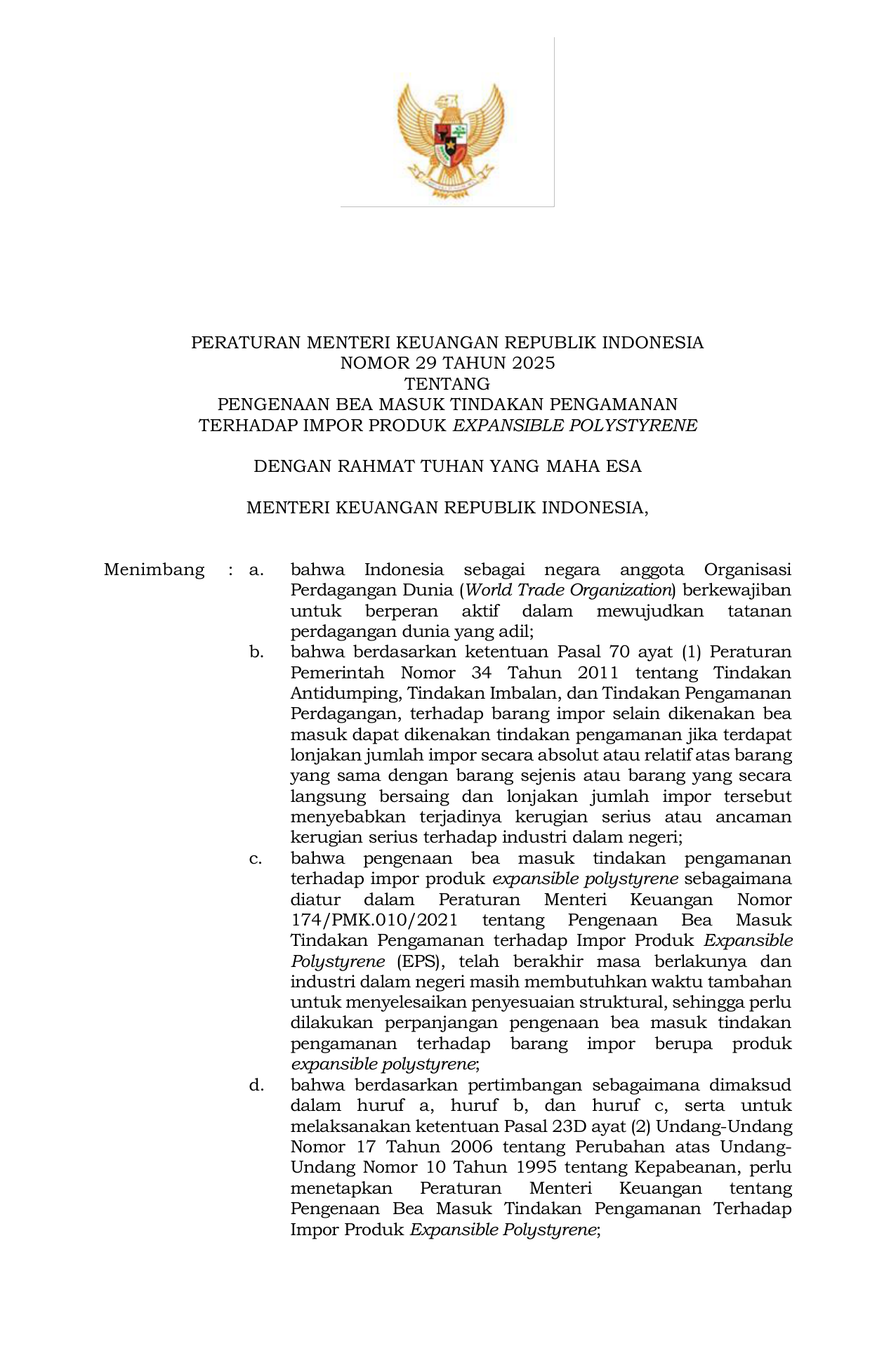 PERMEN Nomor 29 Tahun 2025 | Peraturan Menteri Nomor 29 Tahun 2025 tentang Pengenaan Bea Masuk Tindakan Pengamanan Terhadap Impor Produk Expansible Polystyrene