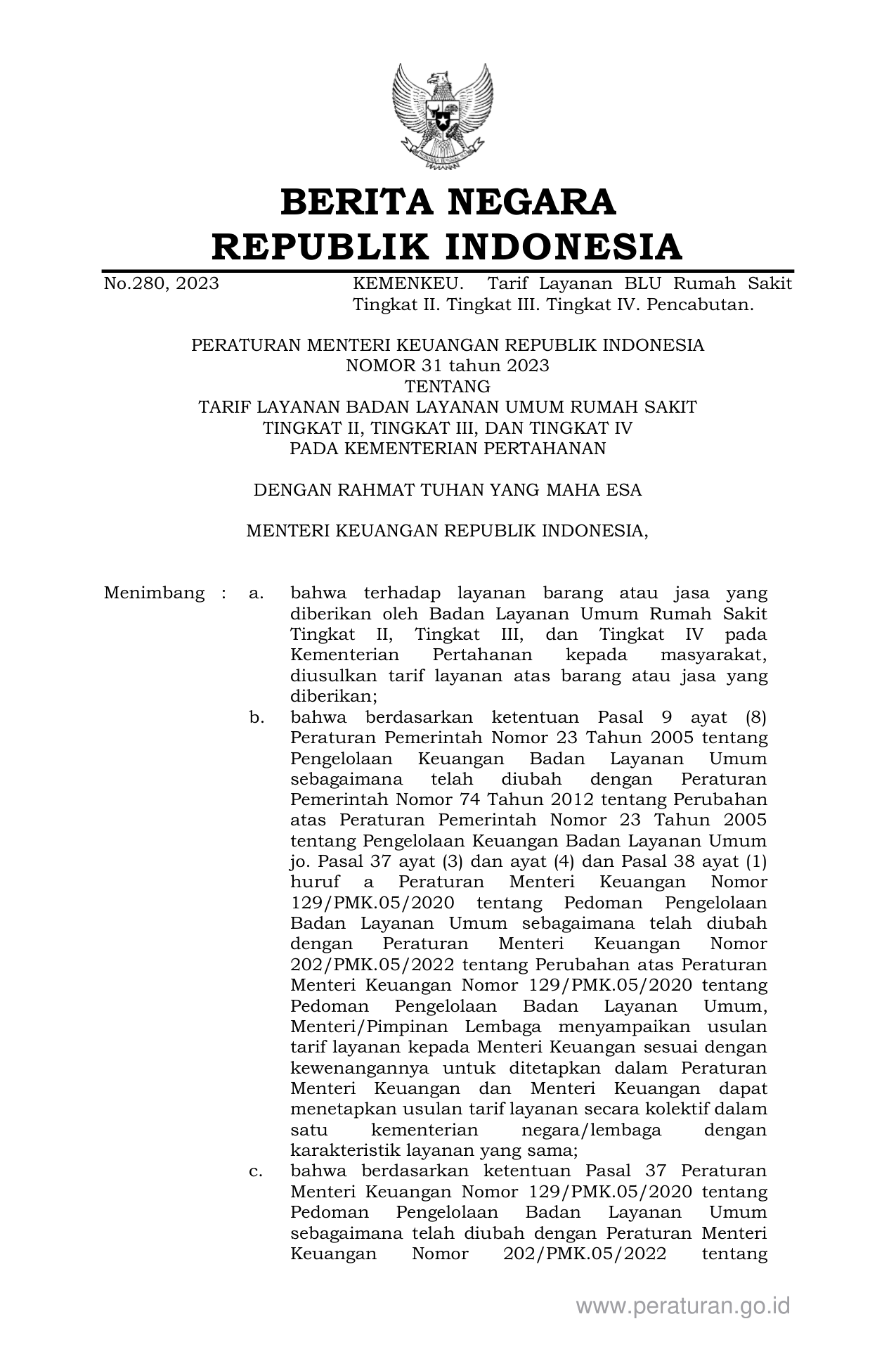 PERMEN Nomor 31 Tahun 2023 | Peraturan Menteri Nomor 31 Tahun 2023 tentang TARIF LAYANAN BADAN LAYANAN UMUM RUMAH SAKIT TINGKAT II, TINGKAT III, DAN TINGKAT IV PADA KEMENTERIAN PERTAHANAN