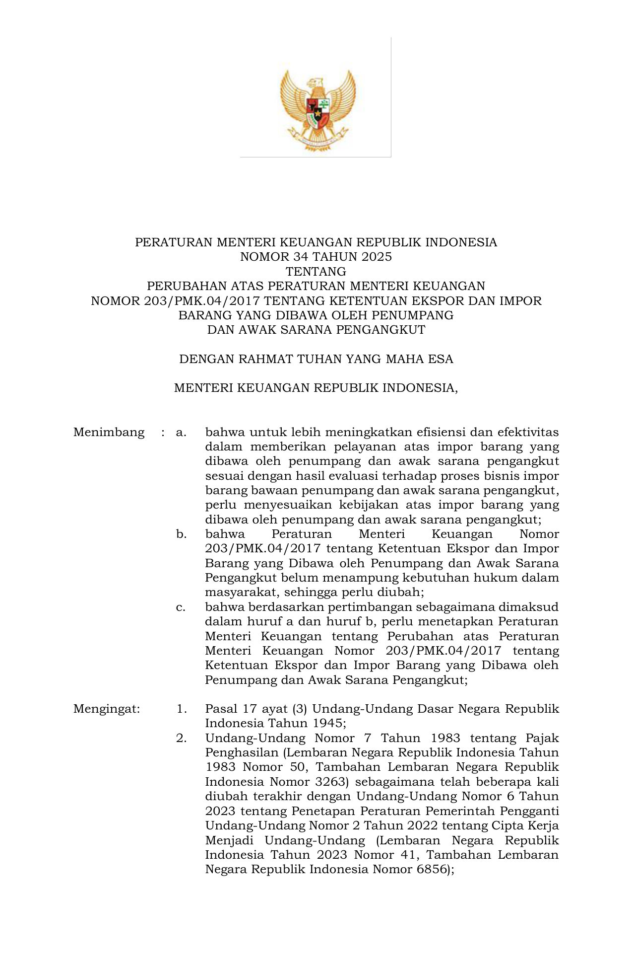 PERMEN Nomor 34 Tahun 2025 | Peraturan Menteri Nomor 34 Tahun 2025 tentang Perubahan atas Peraturan Menteri Keuangan Nomor 203/PMK.04/2017 tentang Ketentuan Ekspor dan Impor Barang yang Dibawa oleh Penumpang dan Awak Sarana Pengangkut