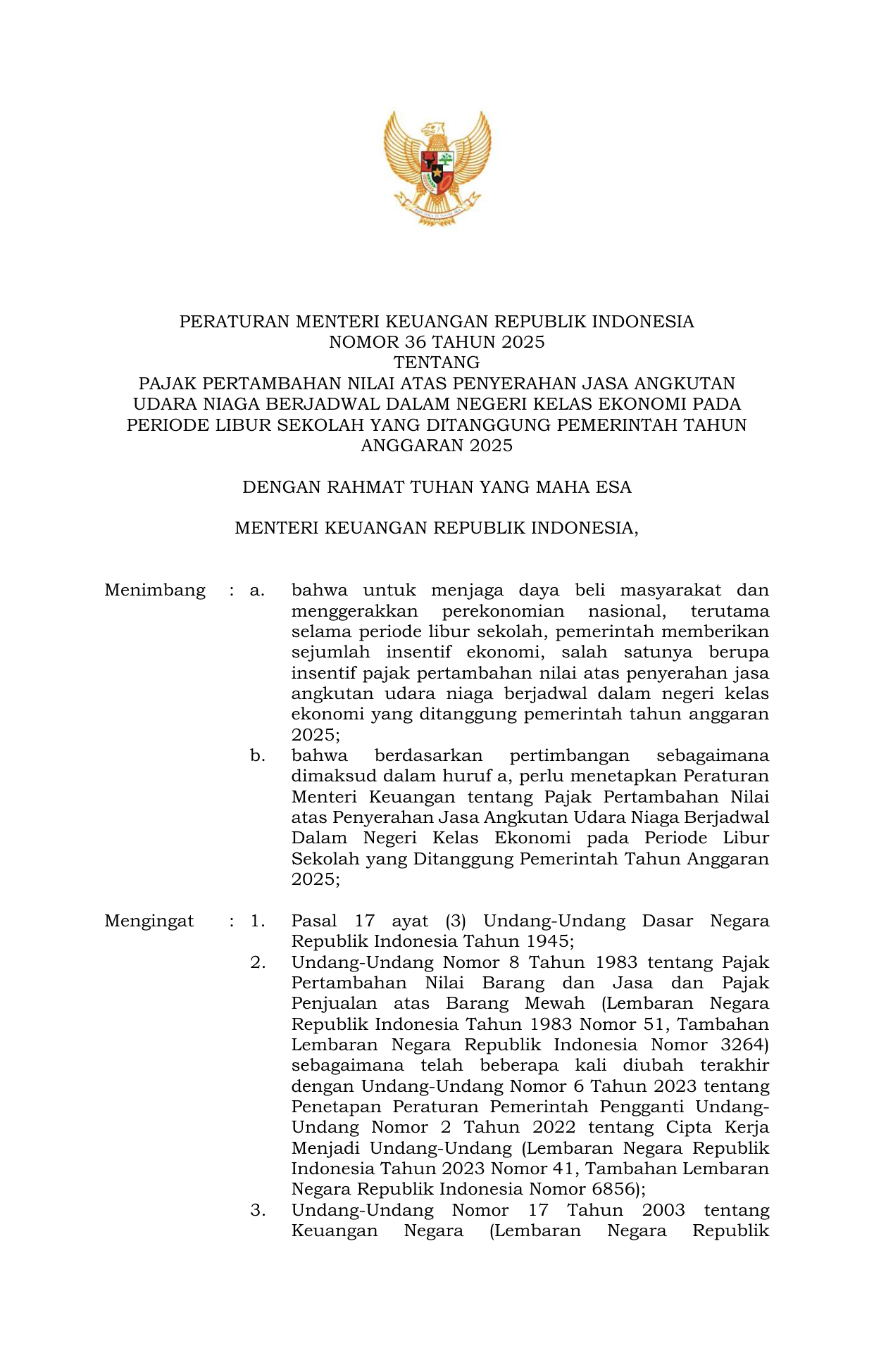 PERMEN Nomor 36 Tahun 2025 | Peraturan Menteri Nomor 36 Tahun 2025 tentang Peraturan Menteri Keuangan tentang Pajak Pertambahan Nilai atas Penyerahan Jasa Angkutan Udara Niaga Berjadwal Dalam Negeri Kelas Ekonomi Pada Periode Libur Sekolah Yang Ditanggung Pemerintah Tahun Anggaran 2025
