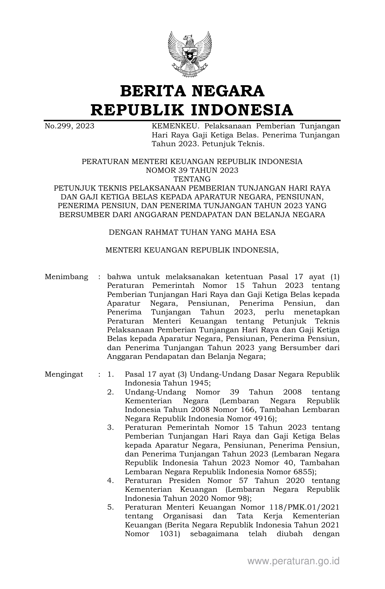 PERMEN Nomor 39 Tahun 2023 | Peraturan Menteri Nomor 39 Tahun 2023 tentang PETUNJUK TEKNIS PELAKSANAAN PEMBERIAN TUNJANGAN HARI RAYA DAN GAJI KETIGA BELAS KEPADA APARATUR NEGARA, PENSIUNAN, PENERIMA PENSIUN, DAN PENERIMA TUNJANGAN TAHUN 2023 YANG BERSUMBER DARI ANGGARAN PENDAPATAN DAN BELANJA NEGARA