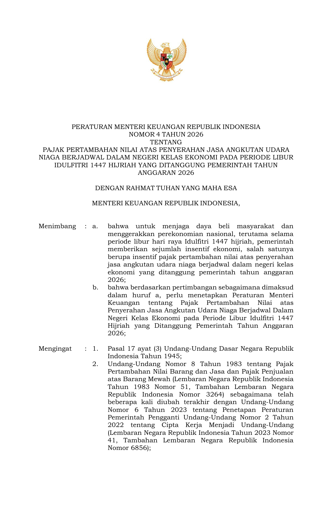 PERMEN Nomor 4 Tahun 2026 | Peraturan Menteri Nomor 4 Tahun 2026 tentang Peraturan Menteri Keuangan tentang Pajak Pertambahan Nilai atas Penyerahan Jasa Angkutan Udara Niaga Berjadwal Dalam Negeri Kelas Ekonomi pada Periode Libur Idulfitri 1447 Hijriah yang Ditanggung Pemerintah Tahun Anggaran 2026