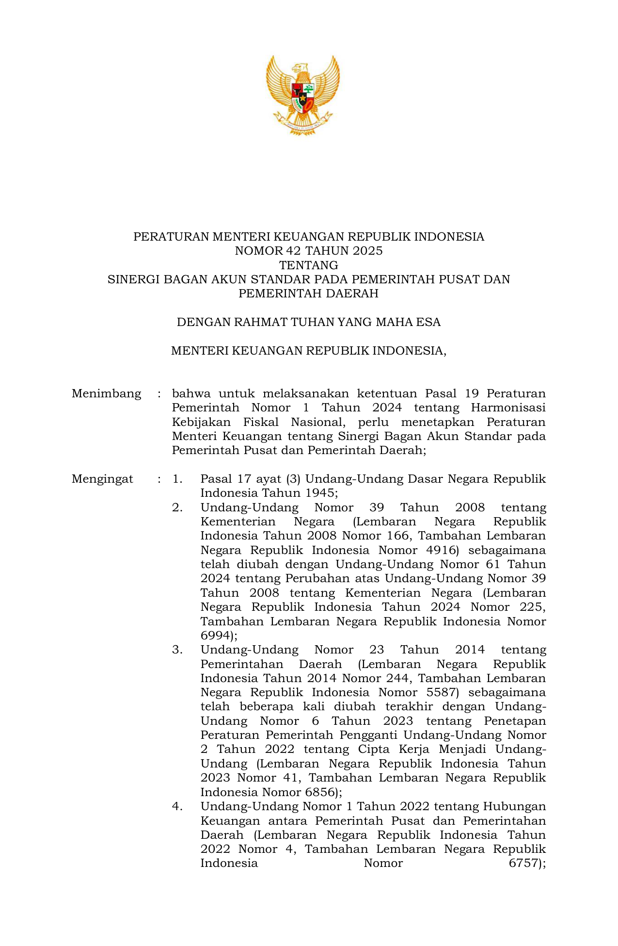 PERMEN Nomor 42 Tahun 2025 | Peraturan Menteri Nomor 42 Tahun 2025 tentang Sinergi Bagan Akun Standar pada Pemerintah Pusat dan Pemerintah Daerah