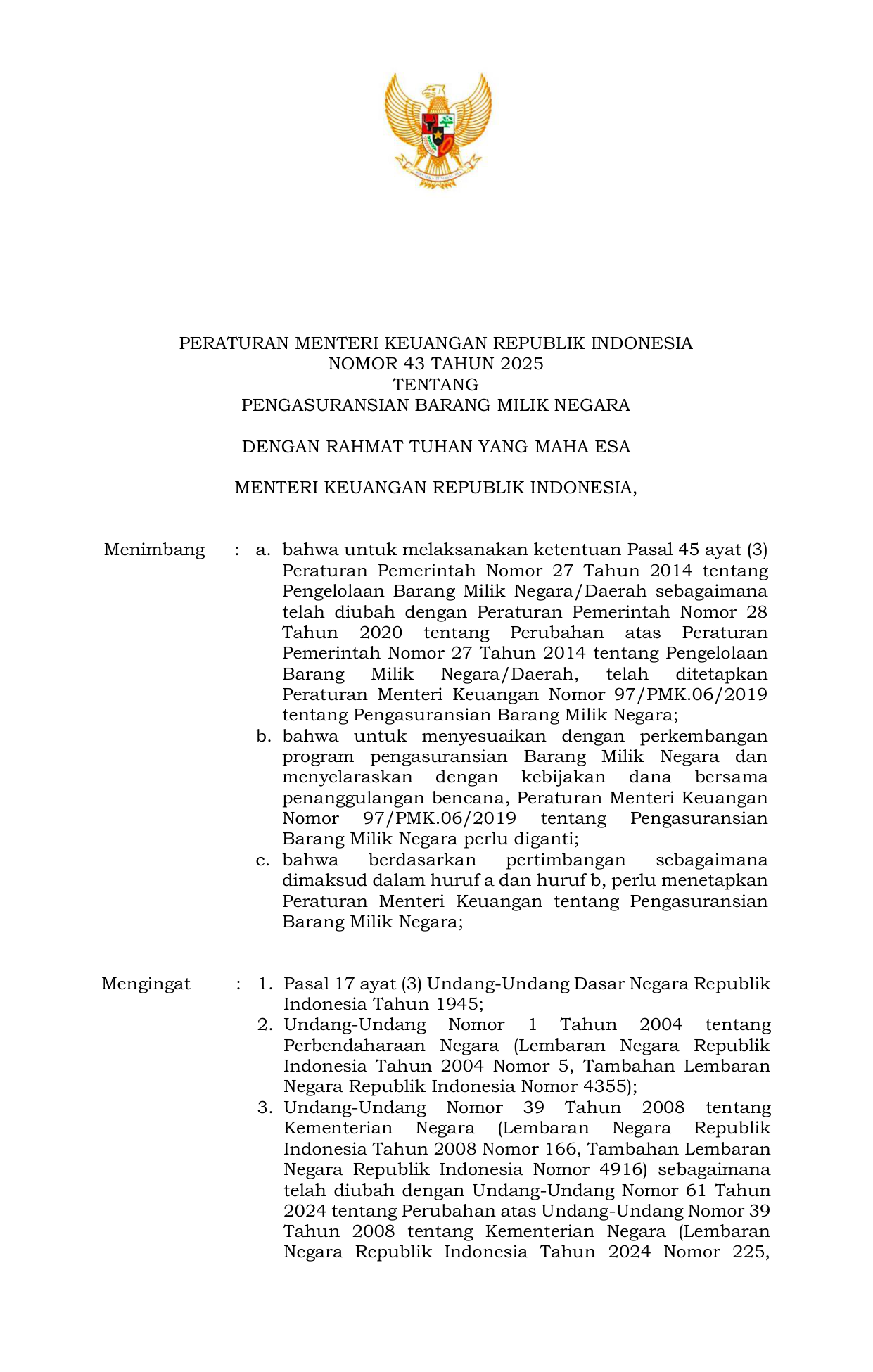 PERMEN Nomor 43 Tahun 2025 | Peraturan Menteri Nomor 43 Tahun 2025 tentang Pengasuransian Barang Milik Negara
