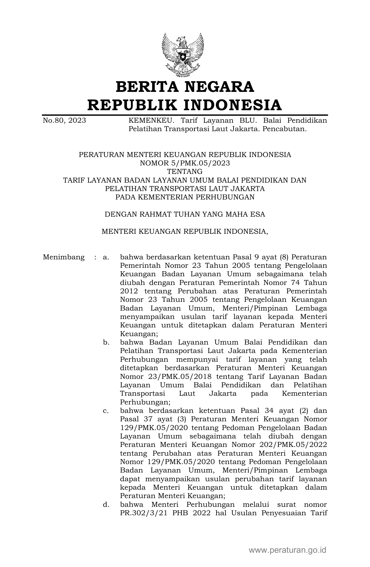 PERMEN Nomor 5-pmk-05-2023 Tahun 2023 | Peraturan Menteri Nomor 5-pmk-05-2023 Tahun 2023 tentang TARIF LAYANAN BADAN LAYANAN UMUM BALAI PENDIDIKAN DAN PELATIHAN TRANSPORTASI LAUT JAKARTA PADA KEMENTERIAN PERHUBUNGAN