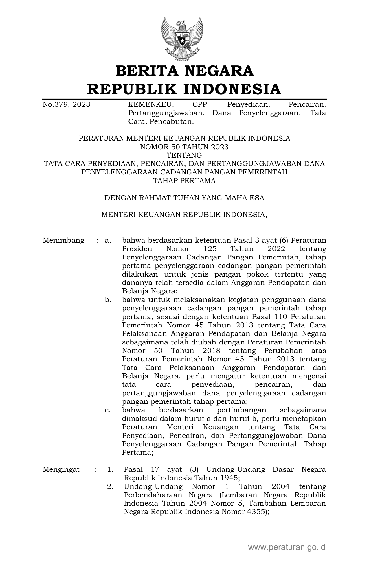 PERMEN Nomor 50 Tahun 2023 | Peraturan Menteri Nomor 50 Tahun 2023 tentang TATA CARA PENYEDIAAN, PENCAIRAN, DAN PERTANGGUNGJAWABAN DANA PENYELENGGARAAN CADANGAN PANGAN PEMERINTAH TAHAP PERTAMA