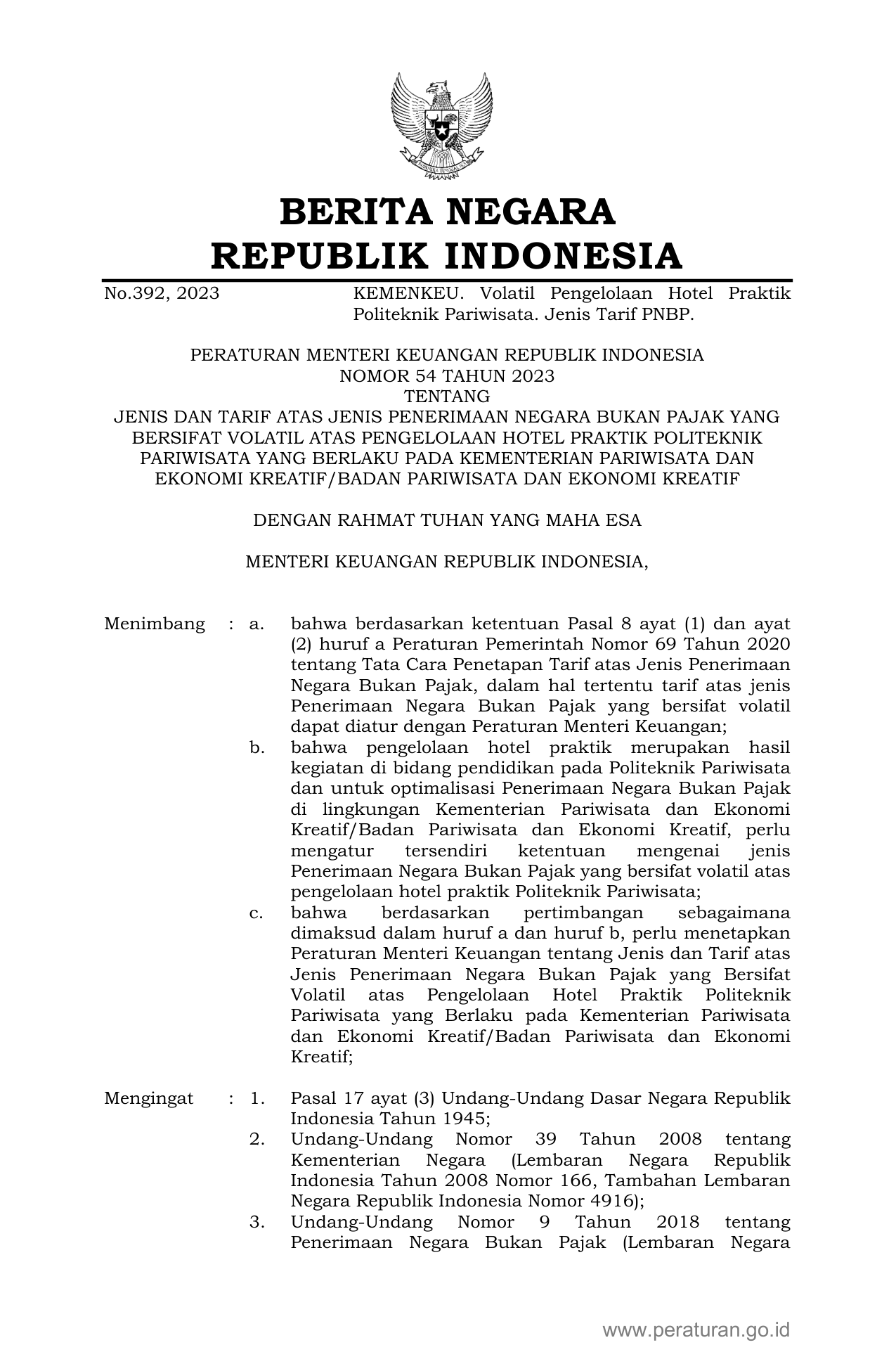 PERMEN Nomor 54 Tahun 2023 | Peraturan Menteri Nomor 54 Tahun 2023 tentang JENIS DAN TARIF ATAS JENIS PENERIMAAN NEGARA BUKAN PAJAK YANG BERSIFAT VOLATIL ATAS PENGELOLAAN HOTEL PRAKTIK POLITEKNIK PARIWISATA YANG BERLAKU PADA KEMENTERIAN PARIWISATA DAN EKONOMI KREATIF/BADAN PARIWISATA DAN EKONOMI KREATIF