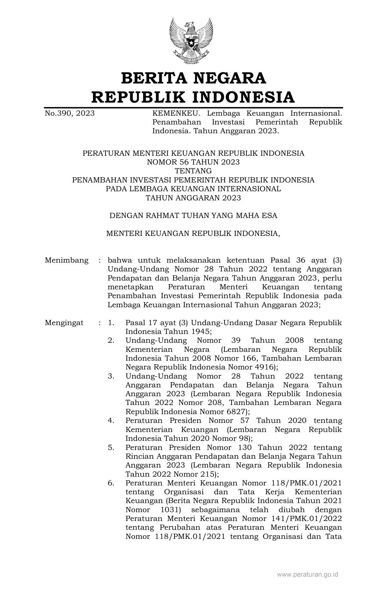 PERMEN Nomor 56 Tahun 2023 | Peraturan Menteri Nomor 56 Tahun 2023 tentang PENAMBAHAN INVESTASI PEMERINTAH REPUBLIK INDONESIA PADA LEMBAGA KEUANGAN INTERNASIONAL TAHUN ANGGARAN 2023