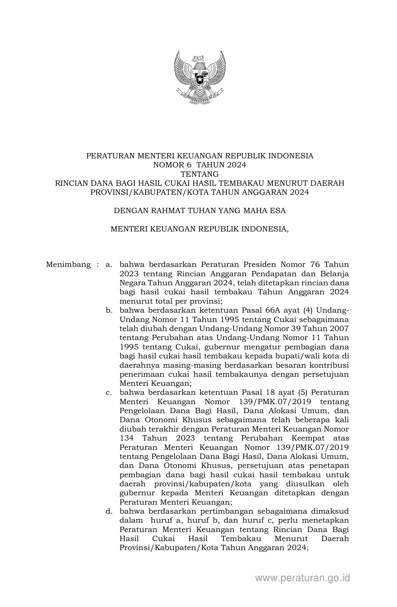 PERMEN Nomor 6 Tahun 2024 | Peraturan Menteri Nomor 6 Tahun 2024 tentang RINCIAN DANA BAGI HASIL CUKAI HASIL TEMBAKAU MENURUT DAERAH PROVINSI/KABUPATEN/KOTA TAHUN ANGGARAN 2024
