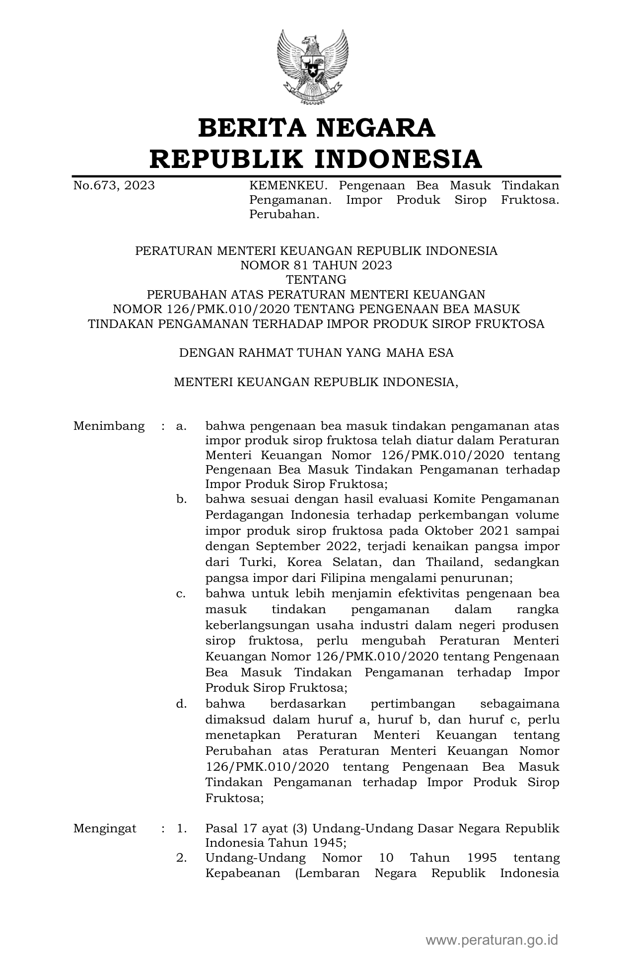 PERMEN Nomor 81 Tahun 2023 | Peraturan Menteri Nomor 81 Tahun 2023 tentang PERUBAHAN ATAS PERATURAN MENTERI KEUANGAN NOMOR 126/PMK.010/2020 TENTANG PENGENAAN BEA MASUK TINDAKAN PENGAMANAN TERHADAP IMPOR PRODUK SIROP FRUKTOSA