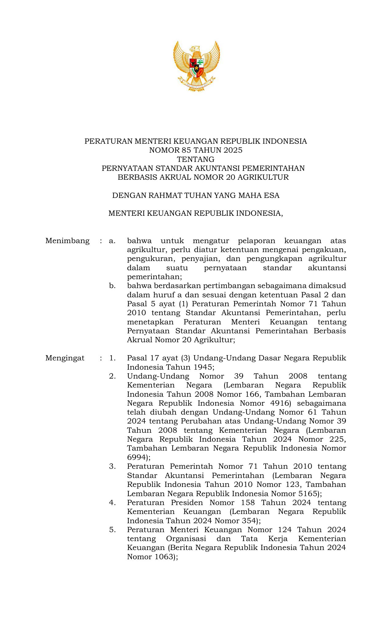 PERMEN Nomor 85 Tahun 2025 | Peraturan Menteri Nomor 85 Tahun 2025 tentang Rancangan Peraturan Menteri Keuangan tentang Pernyataan Standar Akuntansi Pemerintahan Berbasis Akrual Nomor 20 Agrikultur