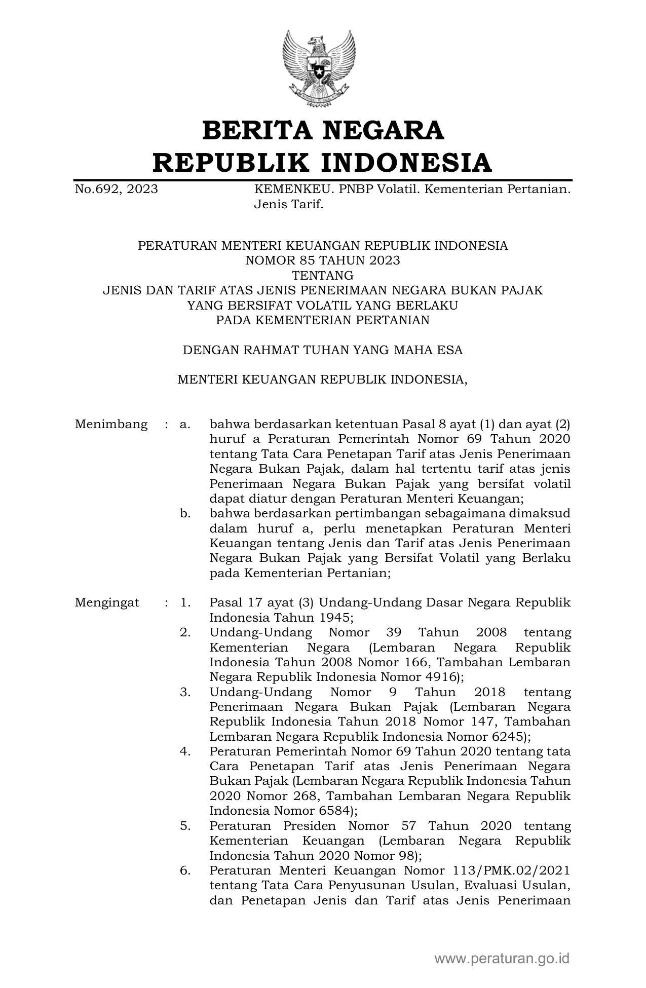 PERMEN Nomor 85 Tahun 2023 | Peraturan Menteri Nomor 85 Tahun 2023 tentang JENIS DAN TARIF ATAS JENIS PENERIMAAN NEGARA BUKAN PAJAK YANG BERSIFAT VOLATIL YANG BERLAKU PADA KEMENTERIAN PERTANIAN