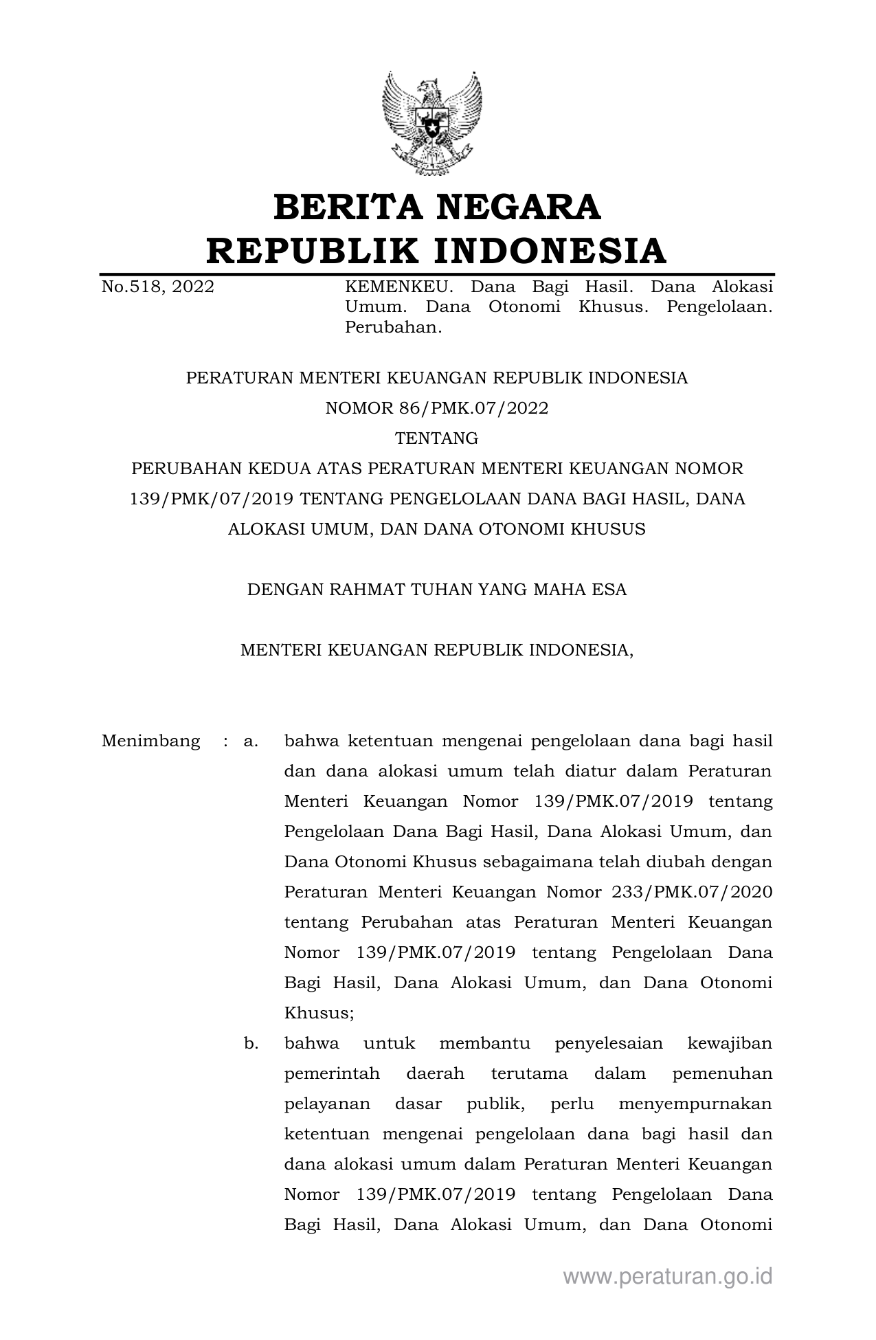 PERMEN Nomor 86-pmk-07-2022 Tahun 2022 | Peraturan Menteri Nomor 86-pmk-07-2022 Tahun 2022 tentang PERUBAHAN KEDUA ATAS PERATURAN MENTERI KEUANGAN NOMOR 139/PMK/07/2019 TENTANG PENGELOLAAN DANA BAGI HASIL, DANA ALOKASI UMUM, DAN DANA OTONOMI KHUSUS