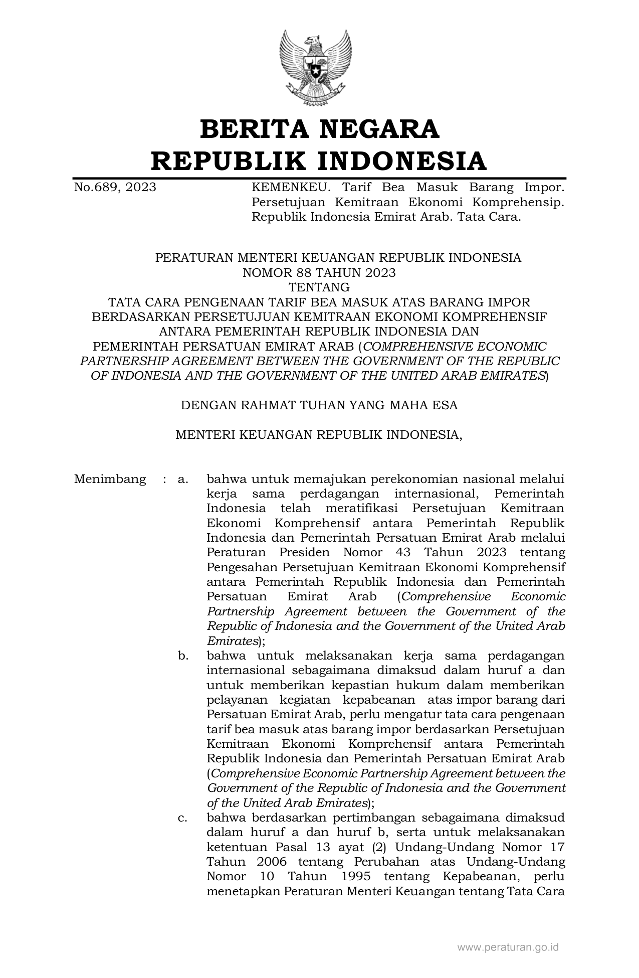 PERMEN Nomor 88 Tahun 2023 | Peraturan Menteri Nomor 88 Tahun 2023 tentang TATA CARA PENGENAAN TARIF BEA MASUK ATAS BARANG IMPOR BERDASARKAN PERSETUJUAN KEMITRAAN EKONOMI KOMPREHENSIF ANTARA PEMERINTAH REPUBLIK INDONESIA DAN PEMERINTAH PERSATUAN EMIRAT ARAB (COMPREHENSIVE ECONOMIC PARTNERSHIP AGREEMENT BETWEEN THE GOVERNMENT OF THE REPUBLIC OF INDONESIA AND THE GOVERNMENT OF THE UNITED ARAB EMIRATES)