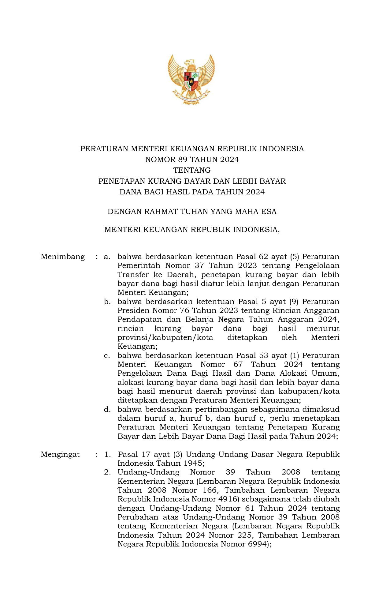 PERMEN Nomor 89 Tahun 2024 | Peraturan Menteri Nomor 89 Tahun 2024 tentang Penetapan Kurang Bayar dan Lebih Bayar Dana Bagi Hasil pada Tahun 2024