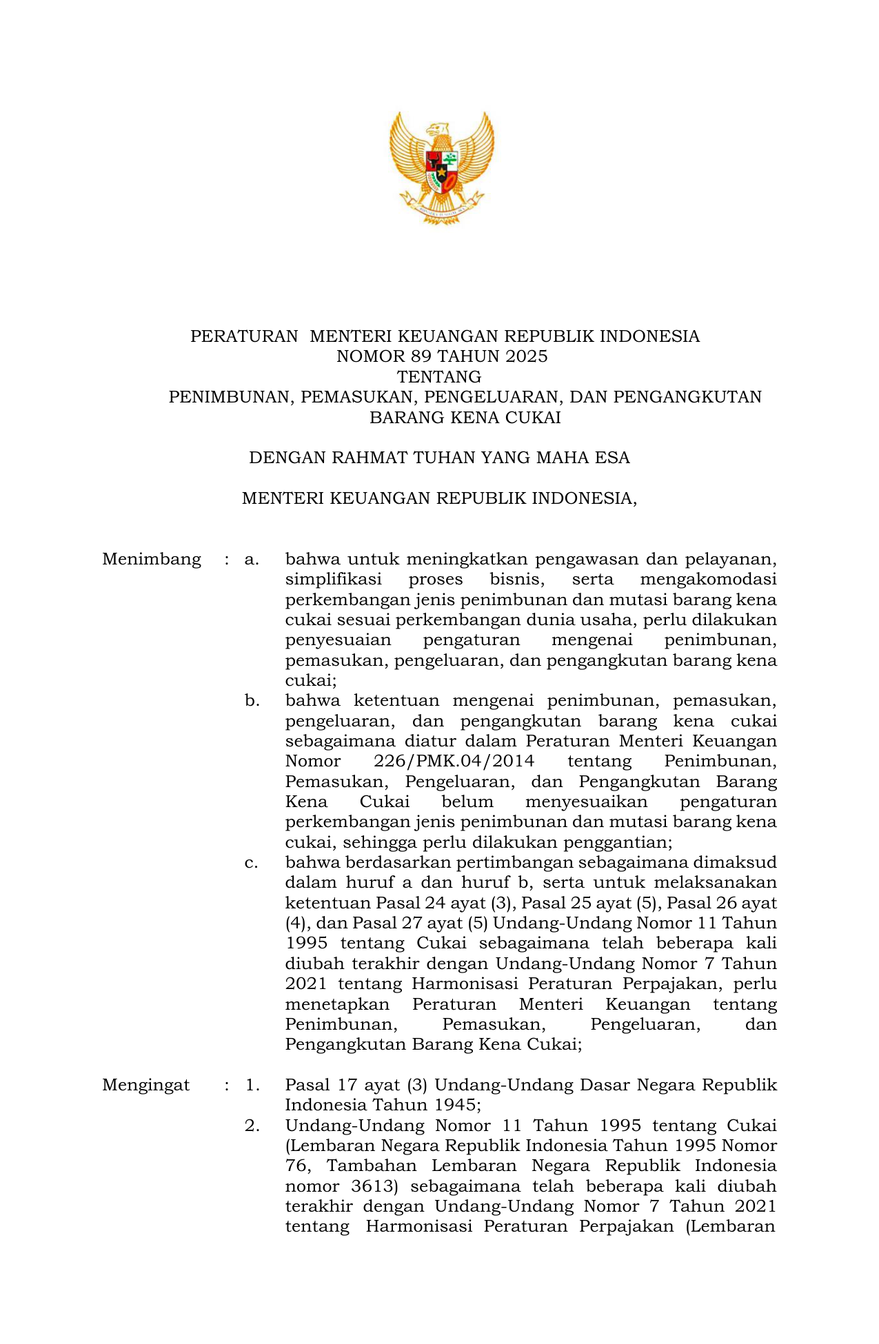 PERMEN Nomor 89 Tahun 2025 | Peraturan Menteri Nomor 89 Tahun 2025 tentang Penimbunan, Pemasukan, Pengeluaran, dan Pengangkutan Barang Kena Cukai