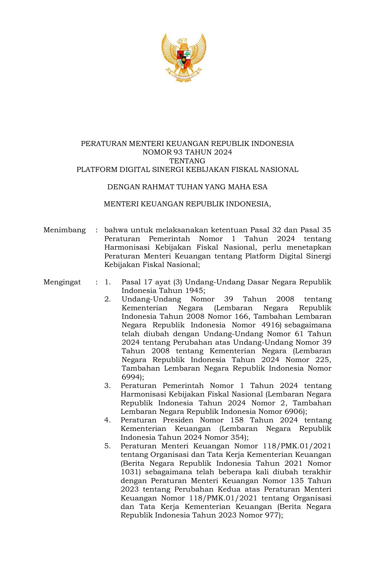 PERMEN Nomor 93 Tahun 2024 | Peraturan Menteri Nomor 93 Tahun 2024 tentang Platform Digital Sinergi Kebijakan Fiskal Nasional