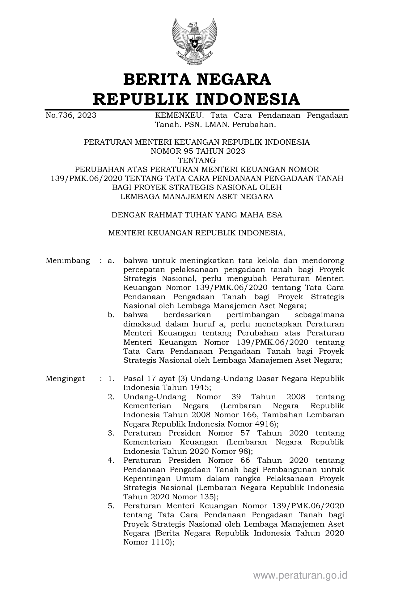 PERMEN Nomor 95 Tahun 2023 | Peraturan Menteri Nomor 95 Tahun 2023 tentang PERUBAHAN ATAS PERATURAN MENTERI KEUANGAN NOMOR 139/PMK.06/2020 TENTANG TATA CARA PENDANAAN PENGADAAN TANAH BAGI PROYEK STRATEGIS NASIONAL OLEH LEMBAGA MANAJEMEN ASET NEGARA