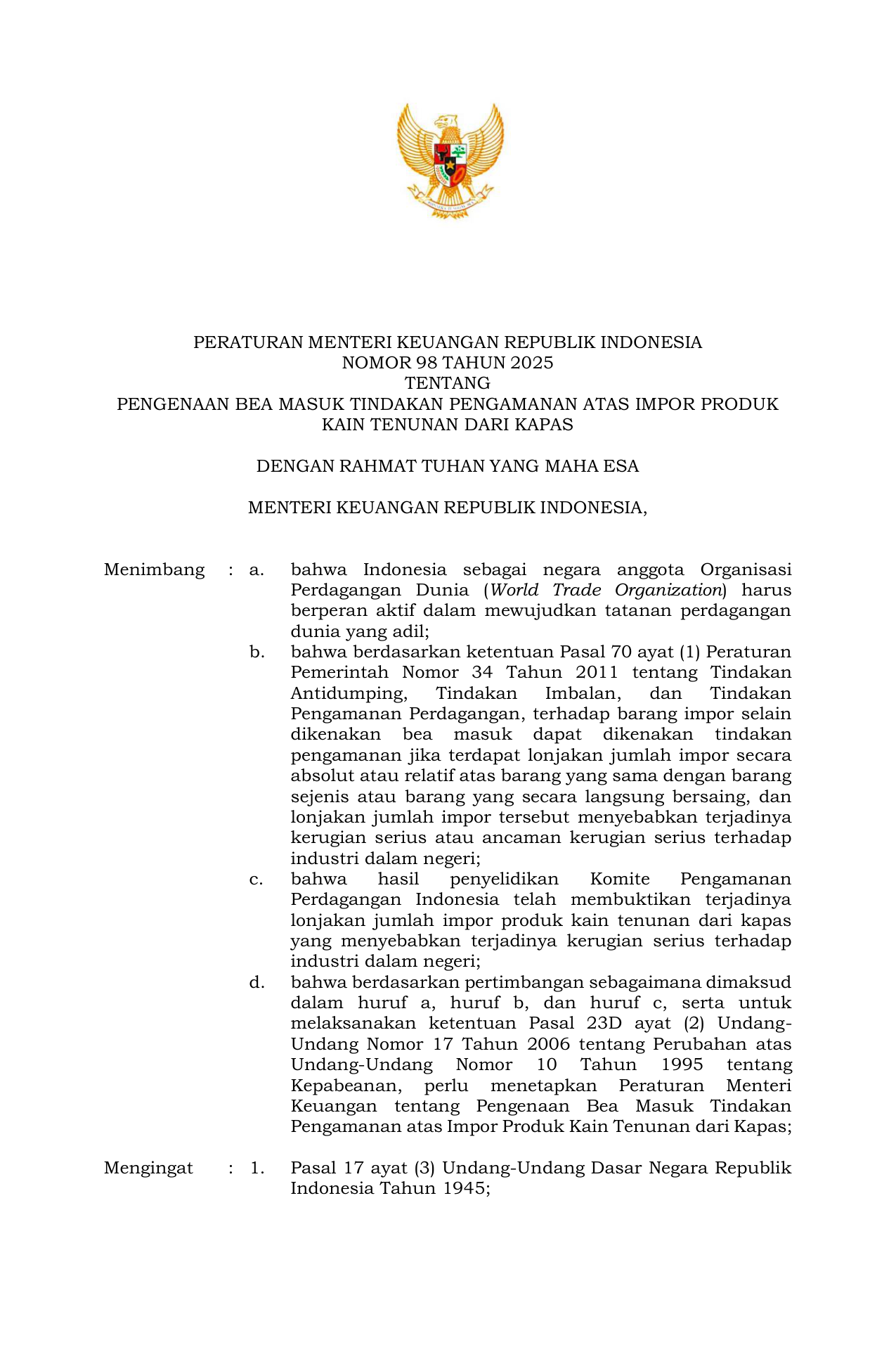 PERMEN Nomor 98+ Tahun 2025 | Peraturan Menteri Nomor 98+ Tahun 2025 tentang Pengenaan Bea Masuk Tindakan Pengamanan atas Impor Produk Kain Tenunan dari Kapas