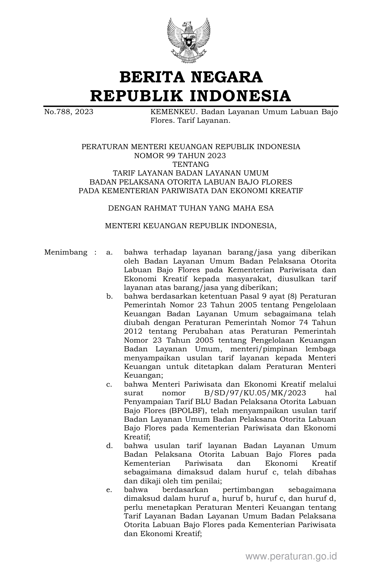 PERMEN Nomor 99 Tahun 2023 | Peraturan Menteri Nomor 99 Tahun 2023 tentang TARIF LAYANAN BADAN LAYANAN UMUM BADAN PELAKSANA OTORITA LABUAN BAJO FLORES PADA KEMENTERIAN PARIWISATA DAN EKONOMI KREATIF