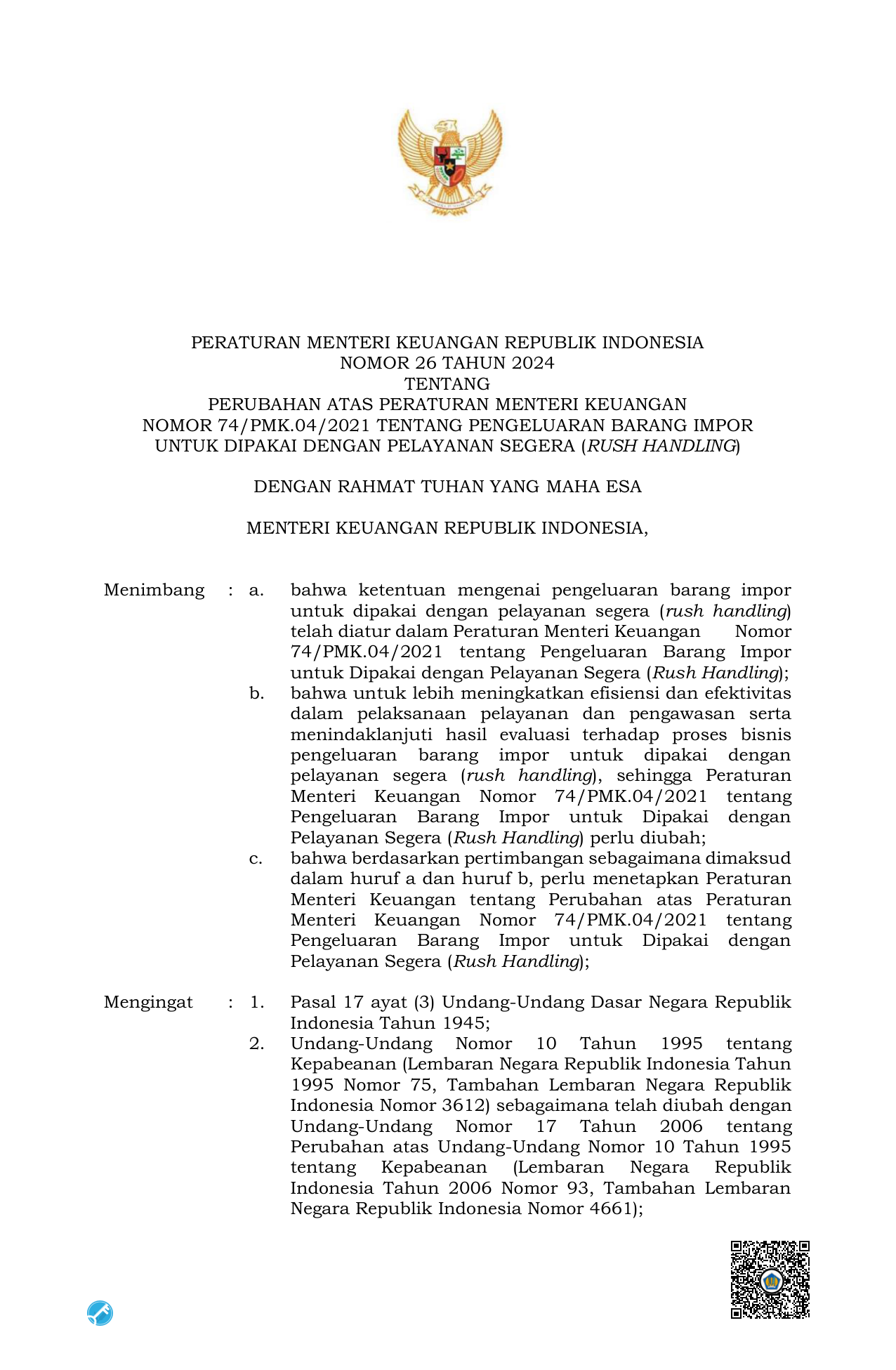 PERMEN Nomor pmk26 Tahun 2024 | Peraturan Menteri Nomor pmk26 Tahun 2024 tentang RPMK tentang Pengeluaran Barang Impor untuk Dipakai dengan Pelayanan Segera (Rush Handling)