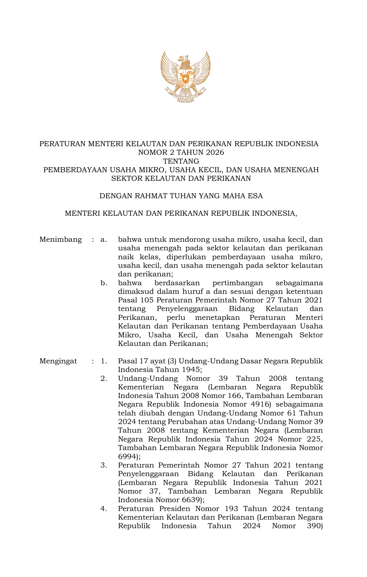 PERMEN Nomor 2 Tahun 2026 | Peraturan Menteri Nomor 2 Tahun 2026 tentang Pemberdayaan Usaha Mikro Usaha Kecil dan Usaha Menengah Sektor Kelautan dan Perikanan