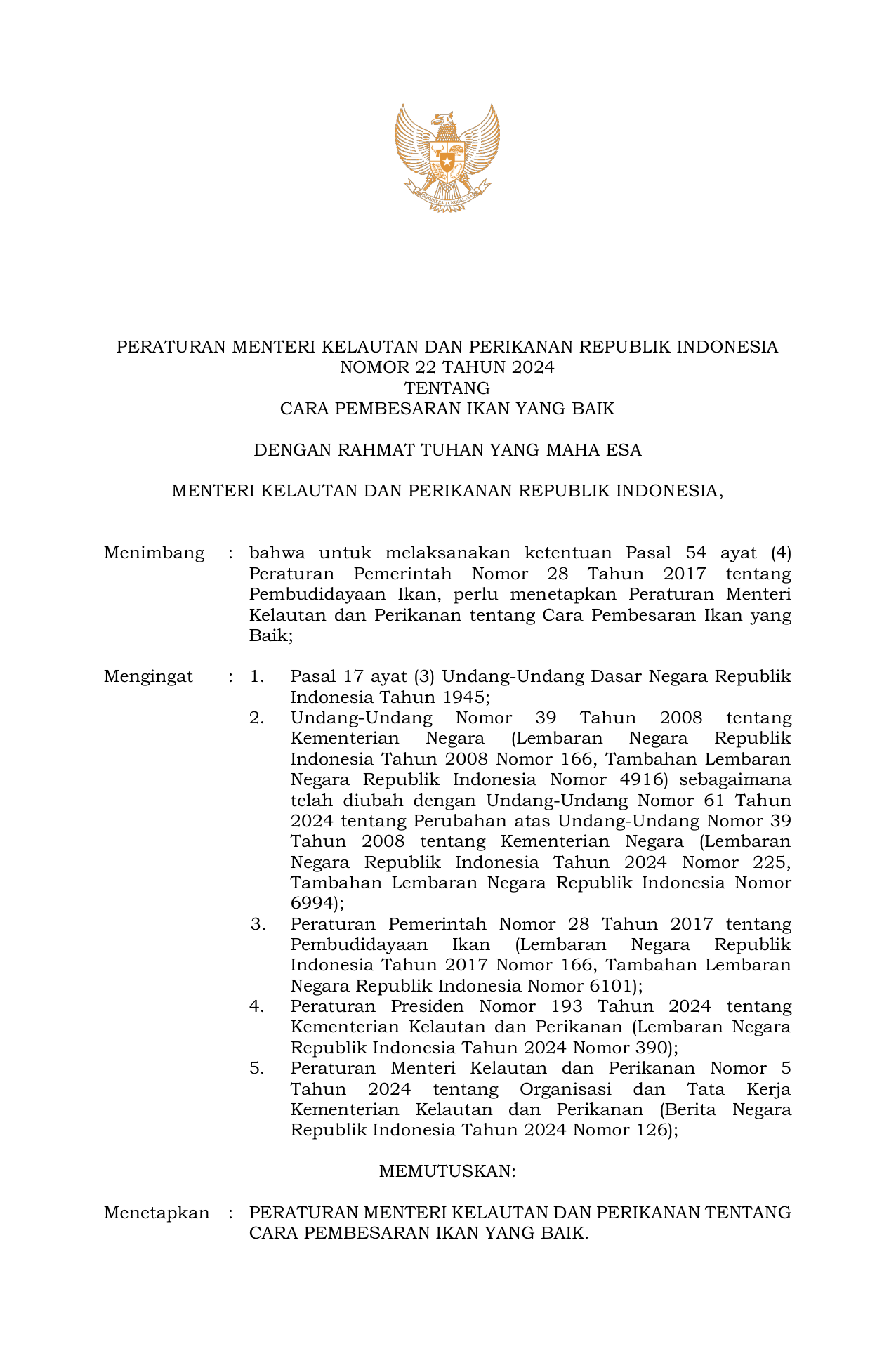 PERMEN Nomor 22 Tahun 2024 | Peraturan Menteri Nomor 22 Tahun 2024 tentang Cara Pembesaran Ikan yang Baik