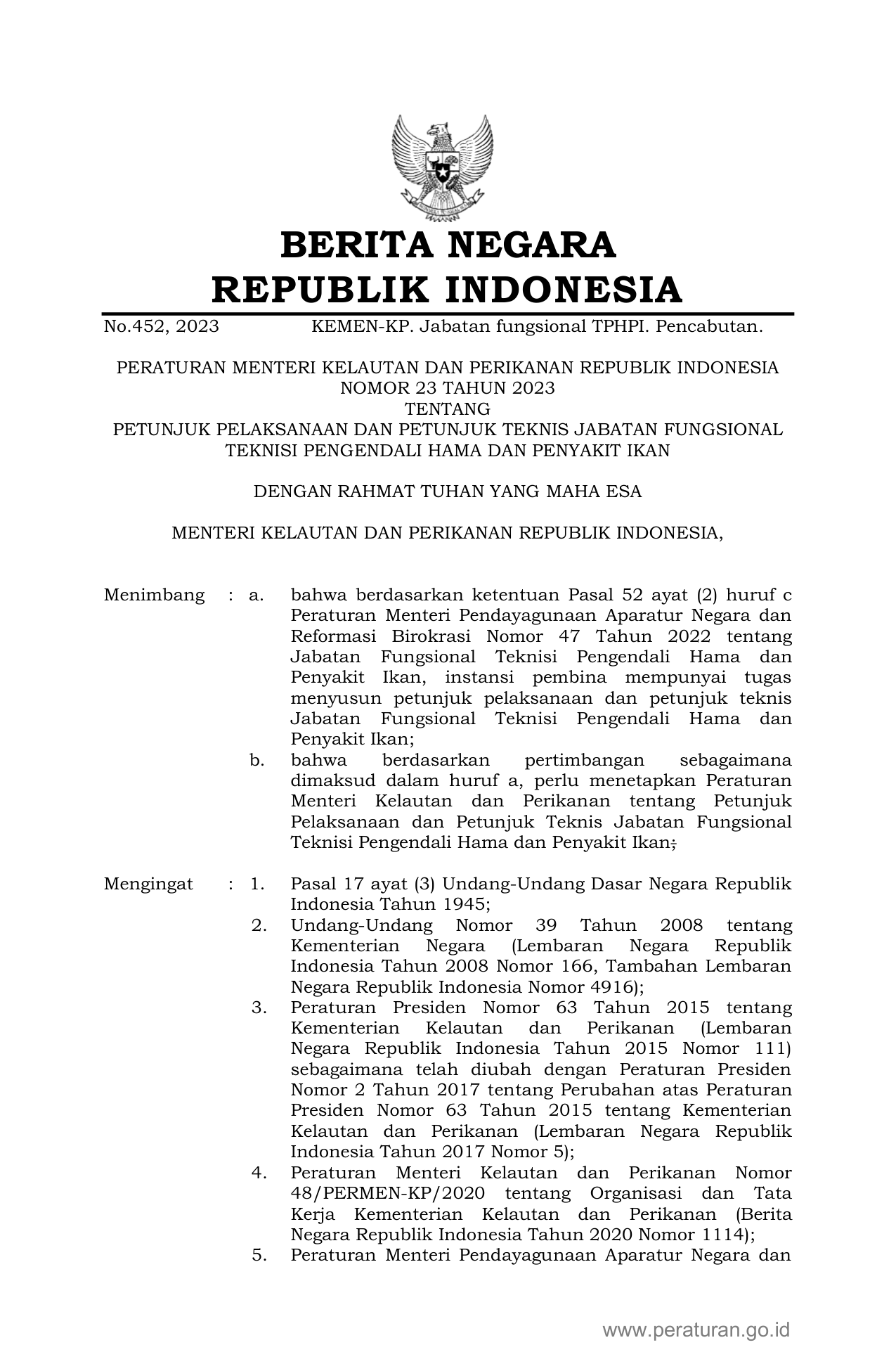 PERMEN Nomor 23 Tahun 2023 | Peraturan Menteri Nomor 23 Tahun 2023 tentang PETUNJUK PELAKSANAAN DAN PETUNJUK TEKNIS JABATAN FUNGSIONAL TEKNISI PENGENDALI HAMA DAN PENYAKIT IKAN