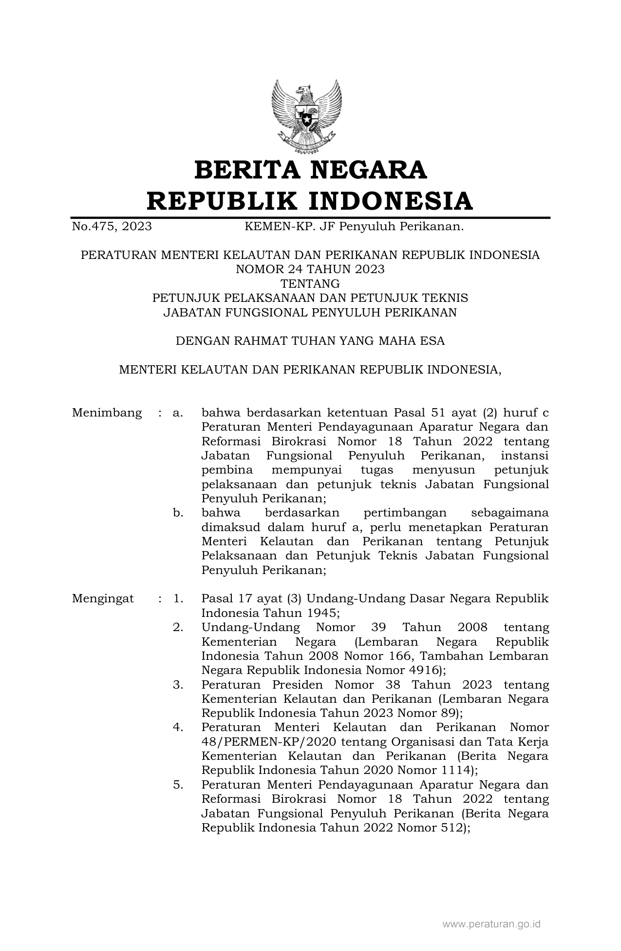 PERMEN Nomor 24 Tahun 2023 | Peraturan Menteri Nomor 24 Tahun 2023 tentang PETUNJUK PELAKSANAAN DAN PETUNJUK TEKNIS JABATAN FUNGSIONAL PENYULUH PERIKANAN