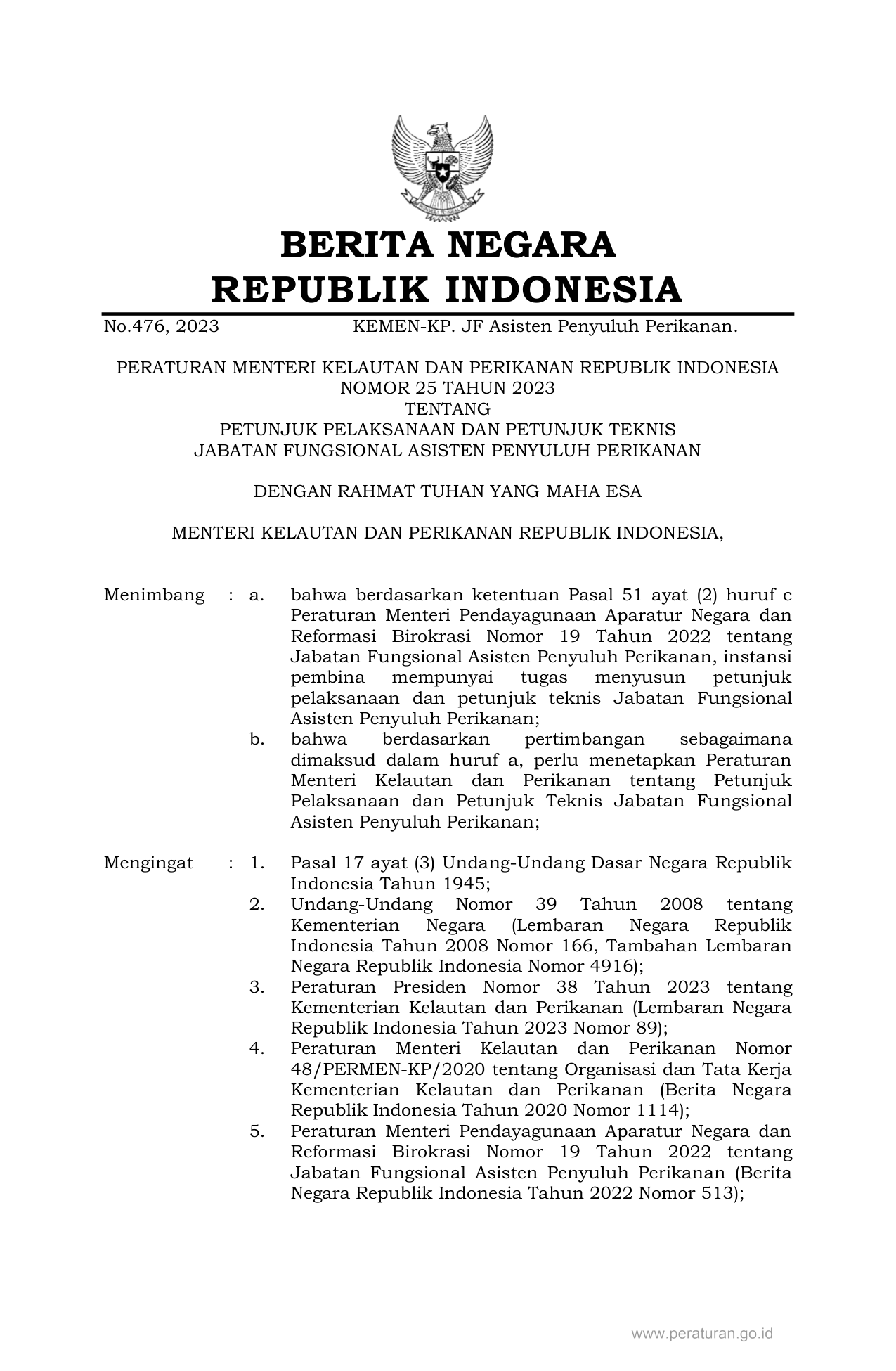 PERMEN Nomor 25 Tahun 2023 | Peraturan Menteri Nomor 25 Tahun 2023 tentang PETUNJUK PELAKSANAAN DAN PETUNJUK TEKNIS JABATAN FUNGSIONAL ASISTEN PENYULUH PERIKANAN
