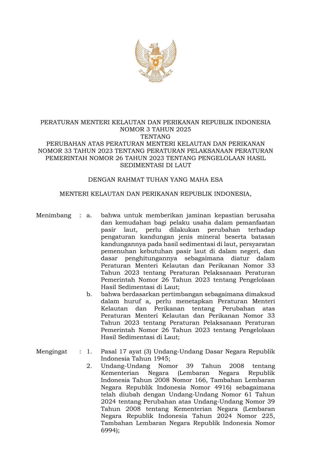 PERMEN Nomor 3 Tahun 2025 | Peraturan Menteri Nomor 3 Tahun 2025 tentang Perubahan atas Peraturan Menteri Kelautan dan Perikanan Nomor 33 Tahun 2023 tentang Peraturan Pelaksanaan Peraturan Pemerintah Nomor 26 Tahun 2023 tentang Pengelolaan Hasil Sedimentasi di Laut