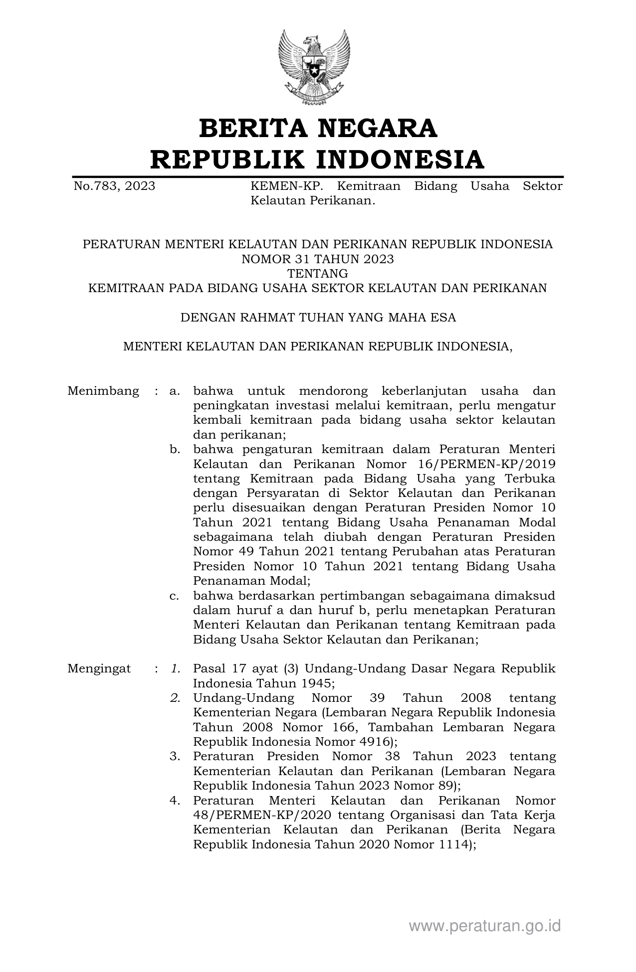 PERMEN Nomor 31 Tahun 2023 | Peraturan Menteri Nomor 31 Tahun 2023 tentang KEMITRAAN PADA BIDANG USAHA SEKTOR KELAUTAN DAN PERIKANAN