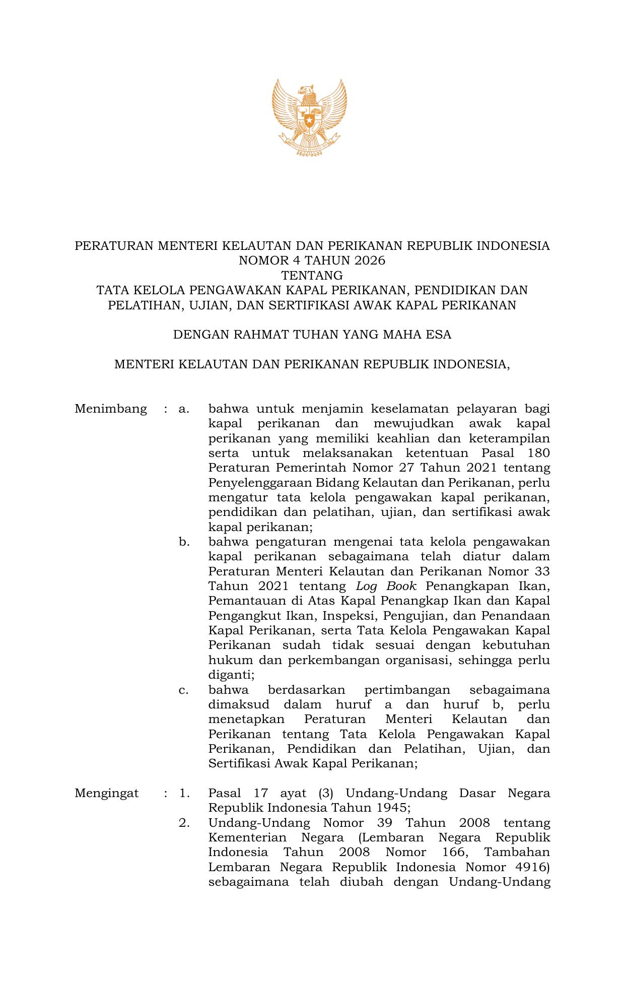 PERMEN Nomor 4 Tahun 2026 | Peraturan Menteri Nomor 4 Tahun 2026 tentang Tata Kelola Pengawakan Kapal Perikanan Pendidikan dan Pelatihan Ujian dan Sertifikasi Awak Kapal Perikanan