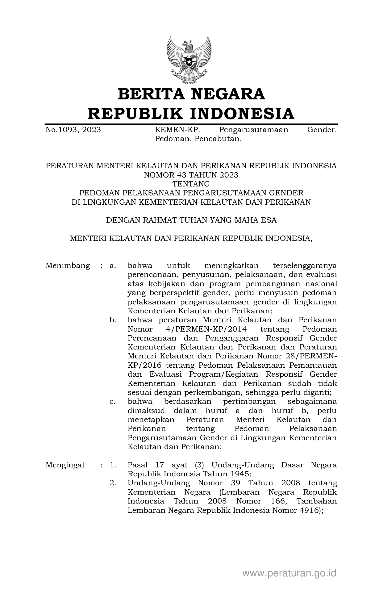 PERMEN Nomor 43 Tahun 2023 | Peraturan Menteri Nomor 43 Tahun 2023 tentang PEDOMAN PELAKSANAAN PENGARUSUTAMAAN GENDER DI LINGKUNGAN KEMENTERIAN KELAUTAN DAN PERIKANAN
