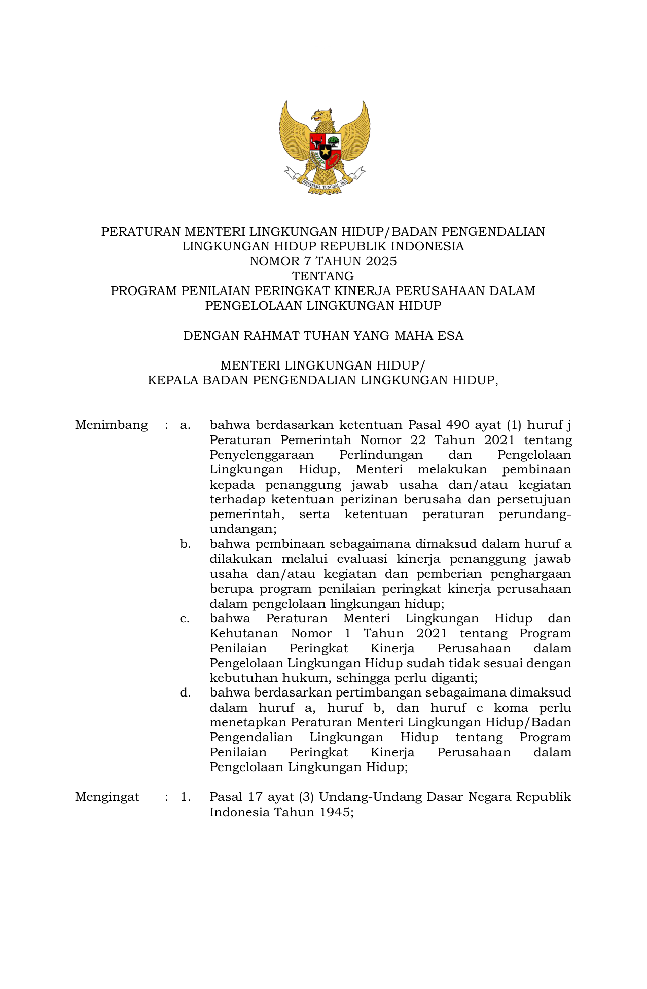 PERMEN Nomor 07 Tahun 2025 | Peraturan Menteri Nomor 07 Tahun 2025 tentang Program Penilaian Peringkat Kinerja Perusahaan Dalam Pengelolaan Lingkungan Hidup