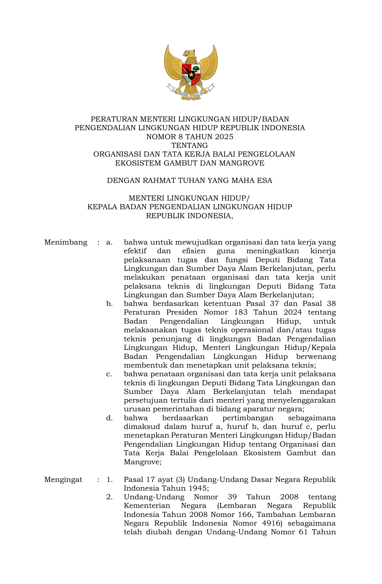 PERMEN Nomor 08 Tahun 2025 | Peraturan Menteri Nomor 08 Tahun 2025 tentang Organisasi dan Tata Kerja Balai Pengelolaan Ekosistem Gambut dan Mangrove