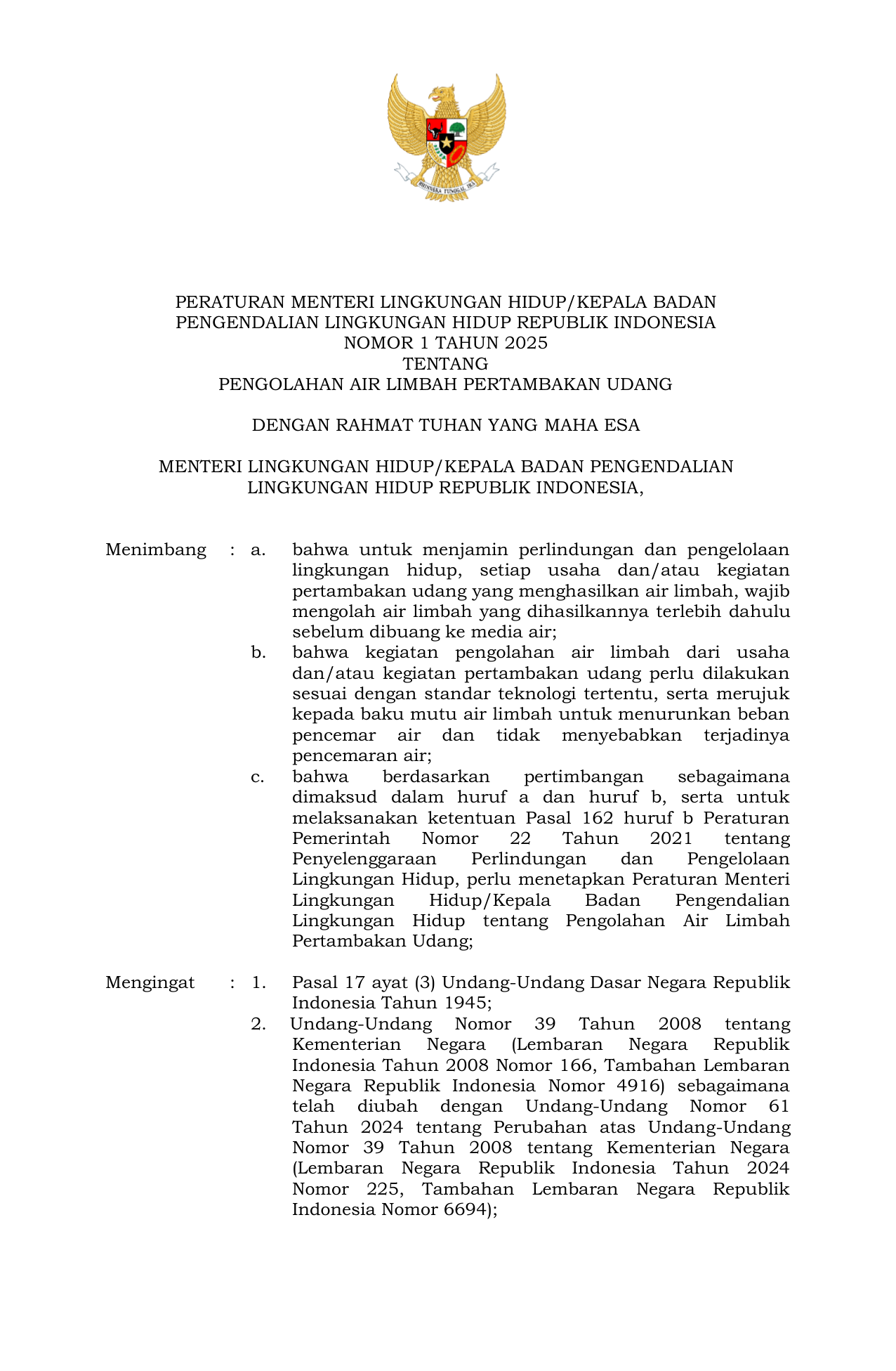 PERMEN Nomor 1 Tahun 2025 | Peraturan Menteri Nomor 1 Tahun 2025 tentang PENGOLAHAN AIR LIMBAH PERTAMBAKAN UDANG