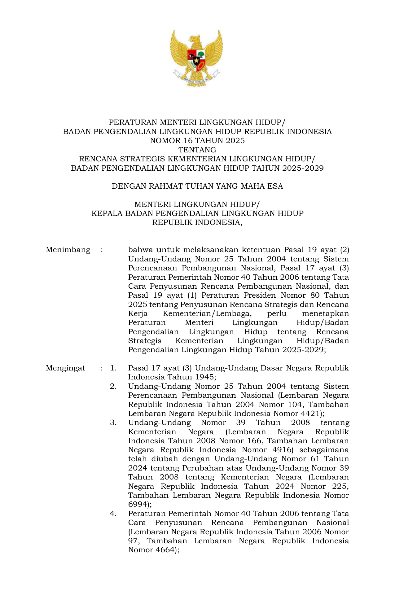 NOMOR 16 TAHUN 2025 TENTANG RENCANA STRATEGIS KEMENTERIAN LINGKUNGAN HIDUP/BADAN PENGENDALIAN LINGKUNGAN HIDUP TAHUN 2025-2029