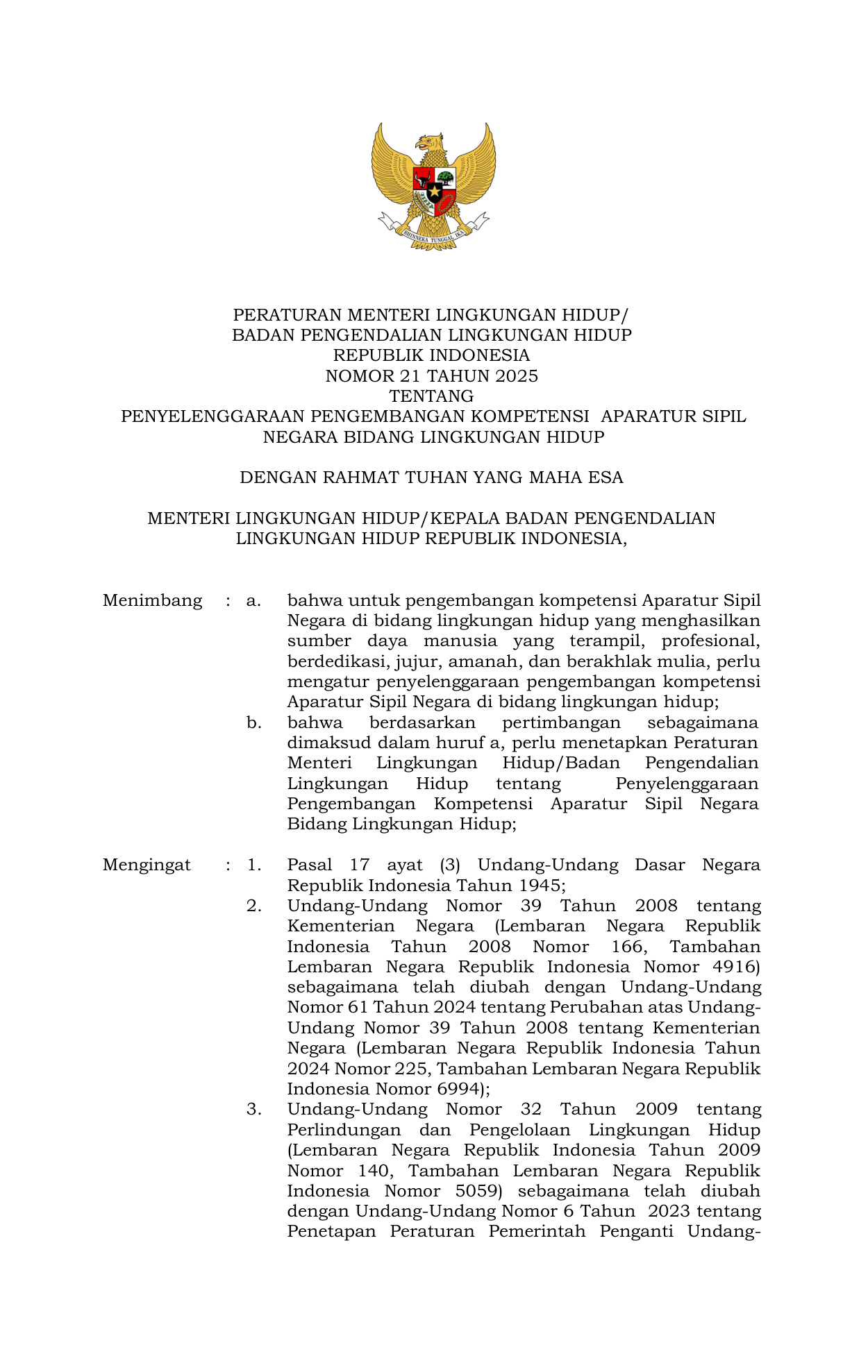 PERMEN Nomor 21 Tahun 2025 | Peraturan Menteri Nomor 21 Tahun 2025 tentang Penyelenggaraan Pengembangan Kompetensi Aparatur Sipil Negara Bidang Lingkungan Hidup
