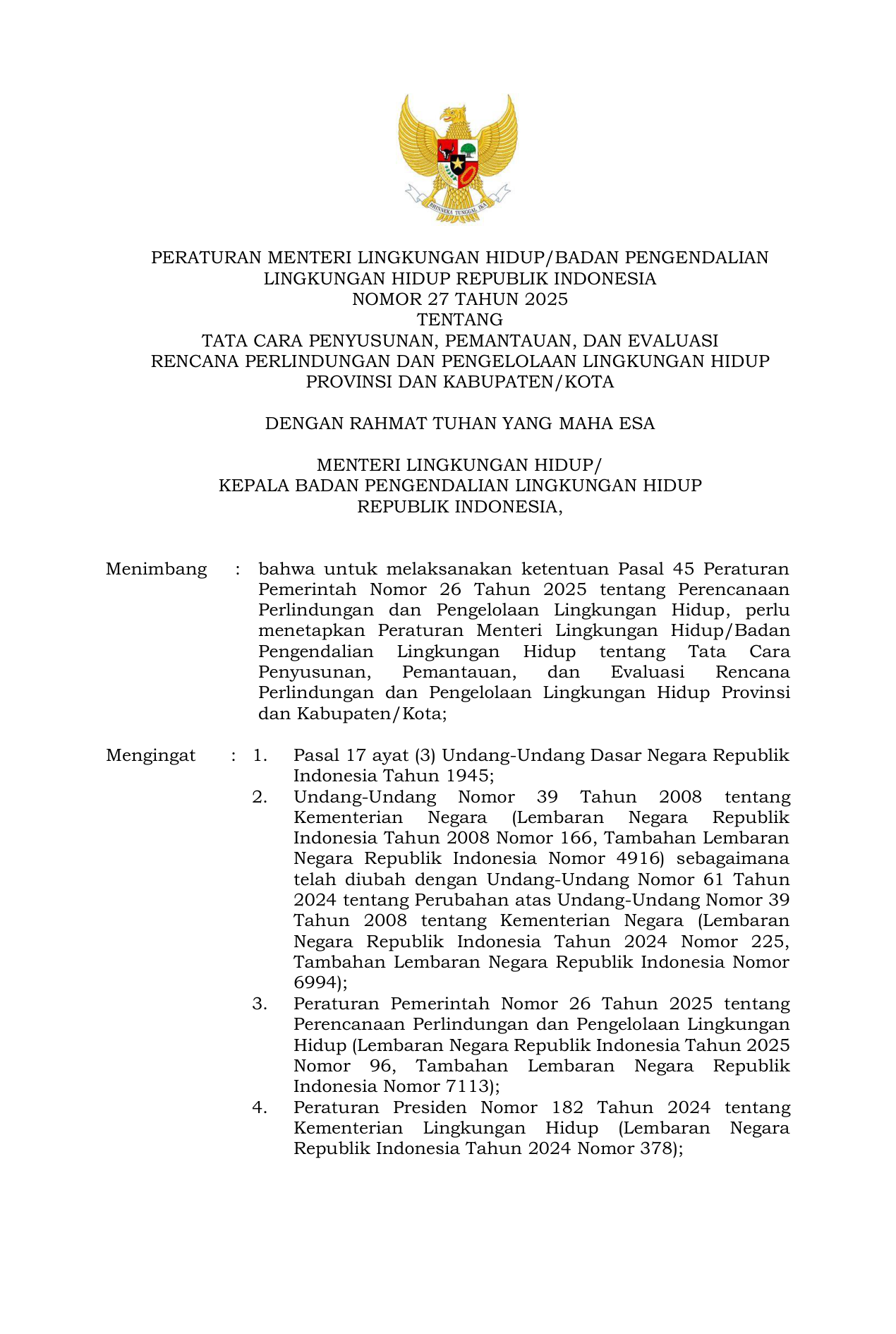 PERMEN Nomor 27 Tahun 2025 | Peraturan Menteri Nomor 27 Tahun 2025 tentang Tata Cara Penyusunan Pemantauan dan Evaluasi Rencana Perlindungan dan Pengelolaan Lingkungan Hidup Provinsi dan Kabupaten Kota