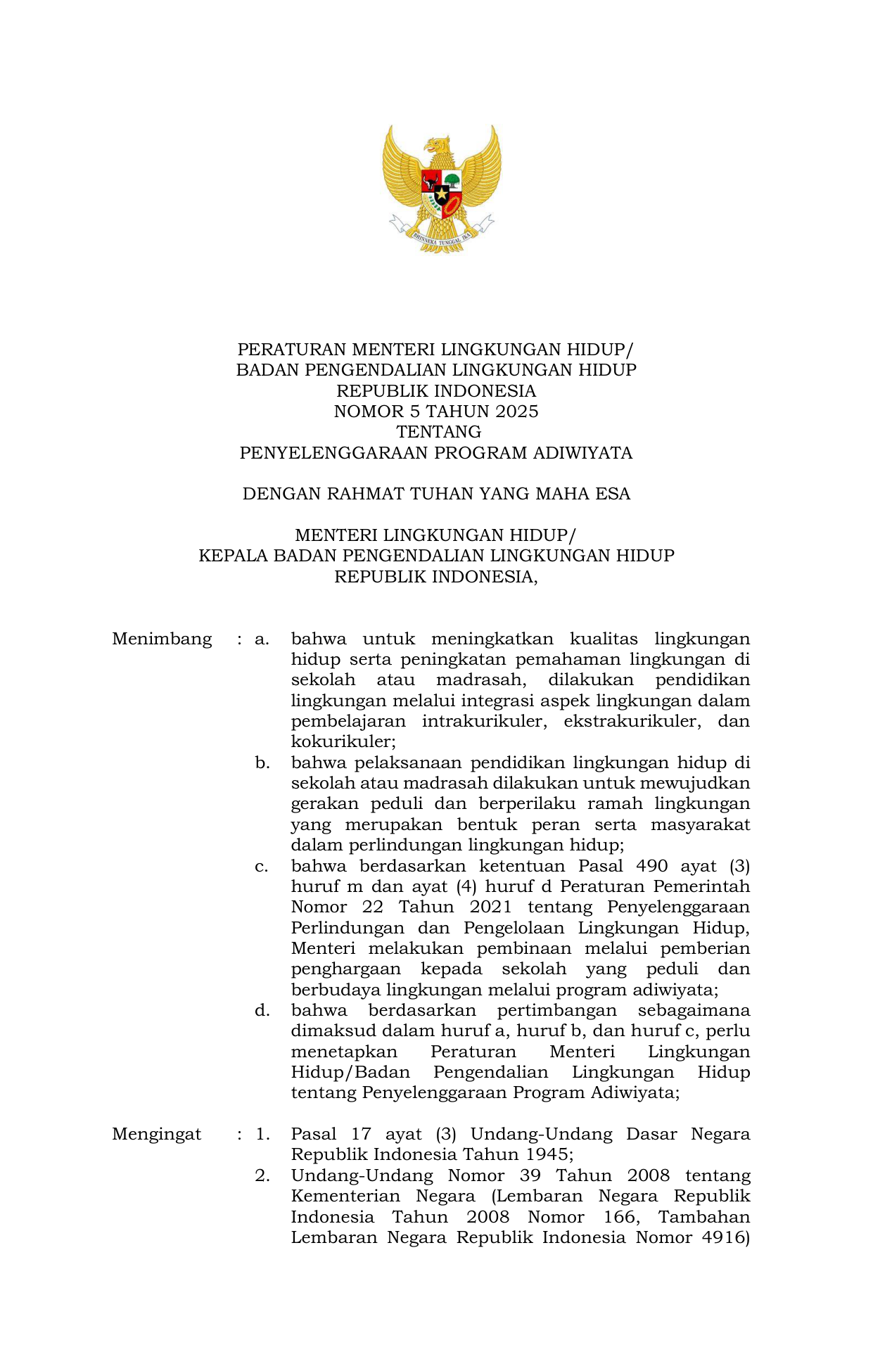 PERMEN Nomor 5 Tahun 2025 | Peraturan Menteri Nomor 5 Tahun 2025 tentang PENYELENGGARAAN PROGRAM ADIWIYATA