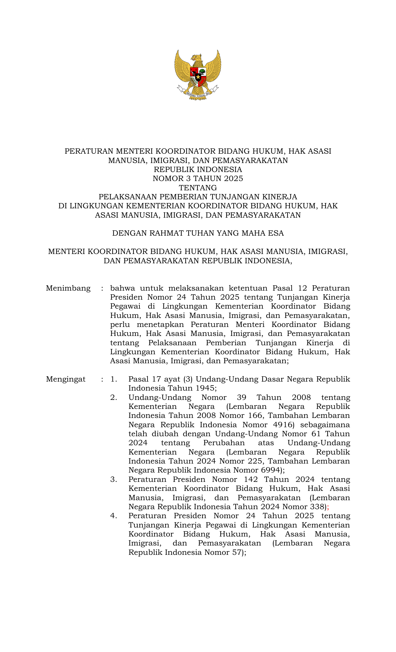 PERMEN Nomor 3 Tahun 2025 | Peraturan Menteri Nomor 3 Tahun 2025 tentang Pelaksanaan Pemberian Tunjangan Kinerja Di Lingkungan Kementerian Koordinator Bidang Hukum Hak Asasi Manusia Imigrasi dan Pemasyarakatan