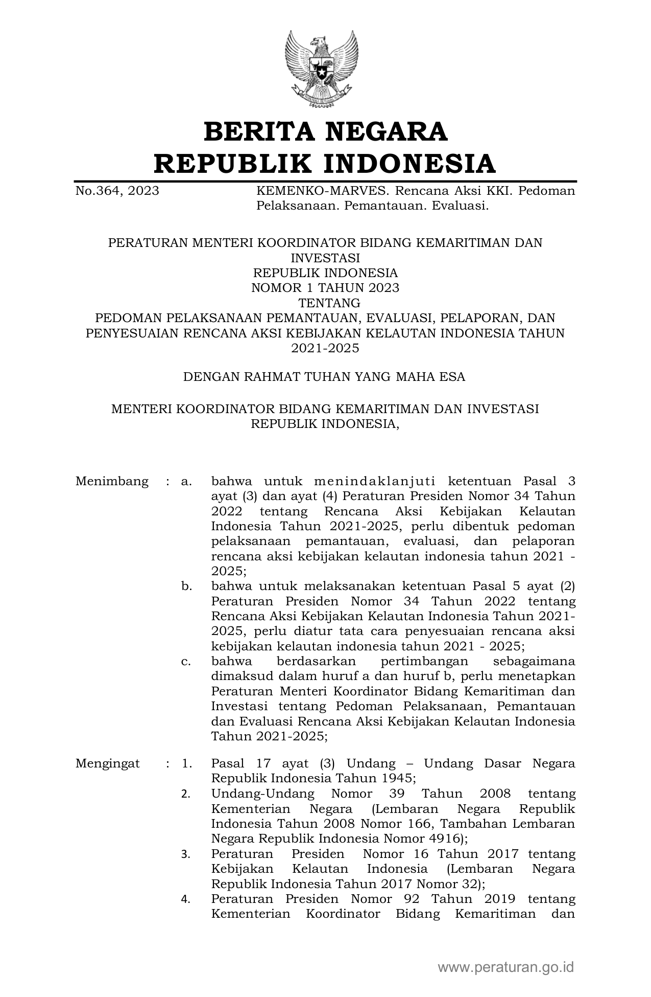 PERMEN Nomor 1 Tahun 2023 | Peraturan Menteri Nomor 1 Tahun 2023 tentang PEDOMAN PELAKSANAAN PEMANTAUAN, EVALUASI, PELAPORAN, DAN PENYESUAIAN RENCANA AKSI KEBIJAKAN KELAUTAN INDONESIA TAHUN 2021-2025