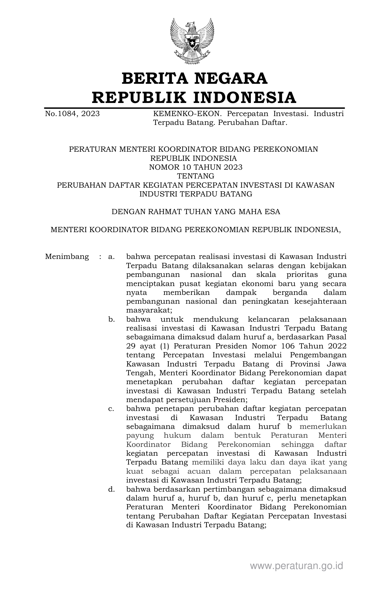 PERMEN Nomor 10 Tahun 2023 | Peraturan Menteri Nomor 10 Tahun 2023 tentang PERUBAHAN DAFTAR KEGIATAN PERCEPATAN INVESTASI DI KAWASAN INDUSTRI TERPADU BATANG