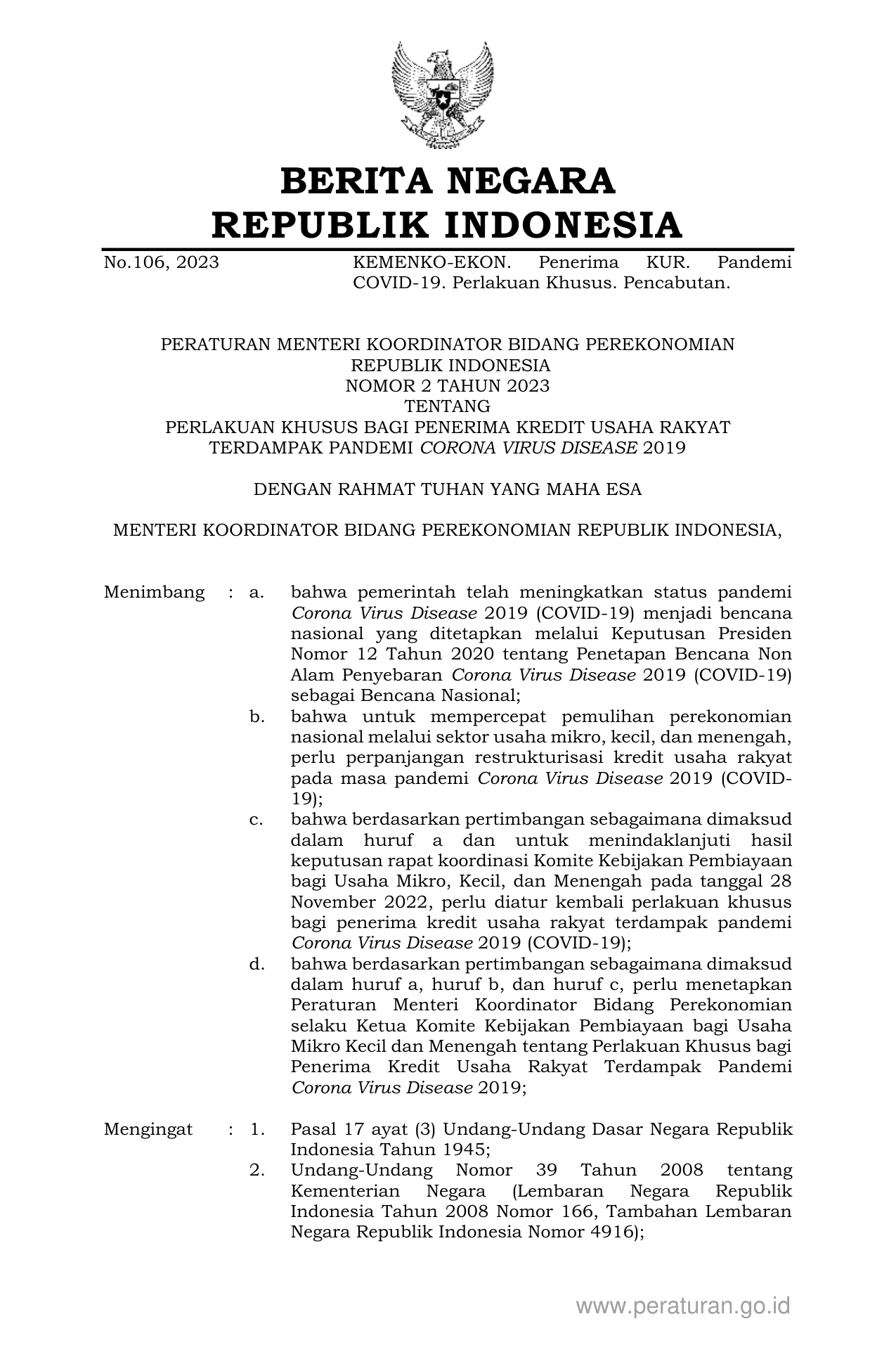 PERMEN Nomor 2 Tahun 2023 | Peraturan Menteri Nomor 2 Tahun 2023 tentang PERLAKUAN KHUSUS BAGI PENERIMA KREDIT USAHA RAKYAT TERDAMPAK PANDEMI CORONA VIRUS DISEASE 2019