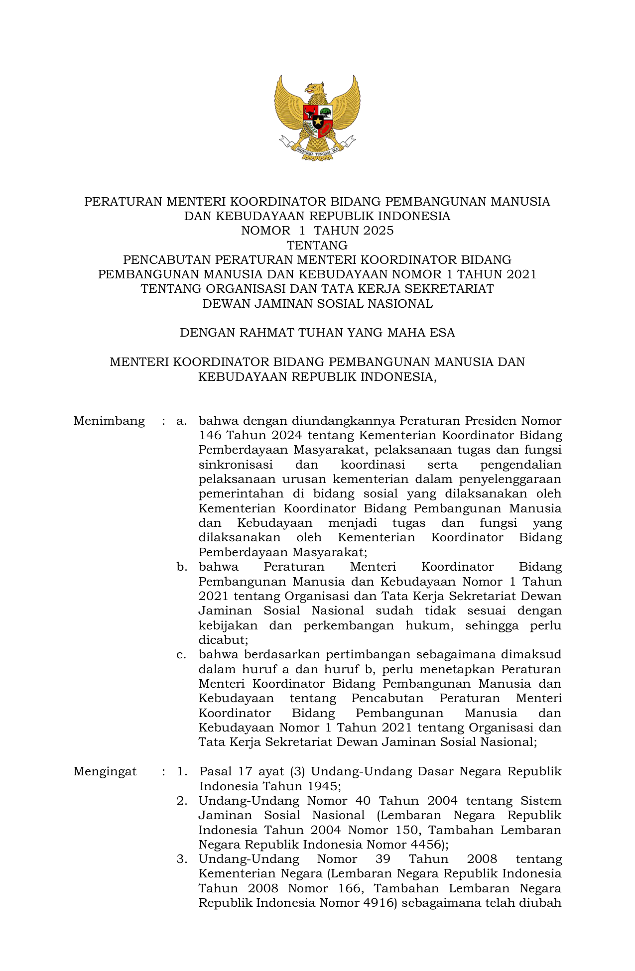 PERMEN Nomor 1 Tahun 2025 | Peraturan Menteri Nomor 1 Tahun 2025 tentang Pencabutan Peraturan Menteri Koordinator Bidang Pembangunan Manusia dan Kebudayaan Nomor 1 Tahun 2021 tentang Organisasi dan Tata Kerja Sekretariat Dewan Jaminan Sosial Nasional