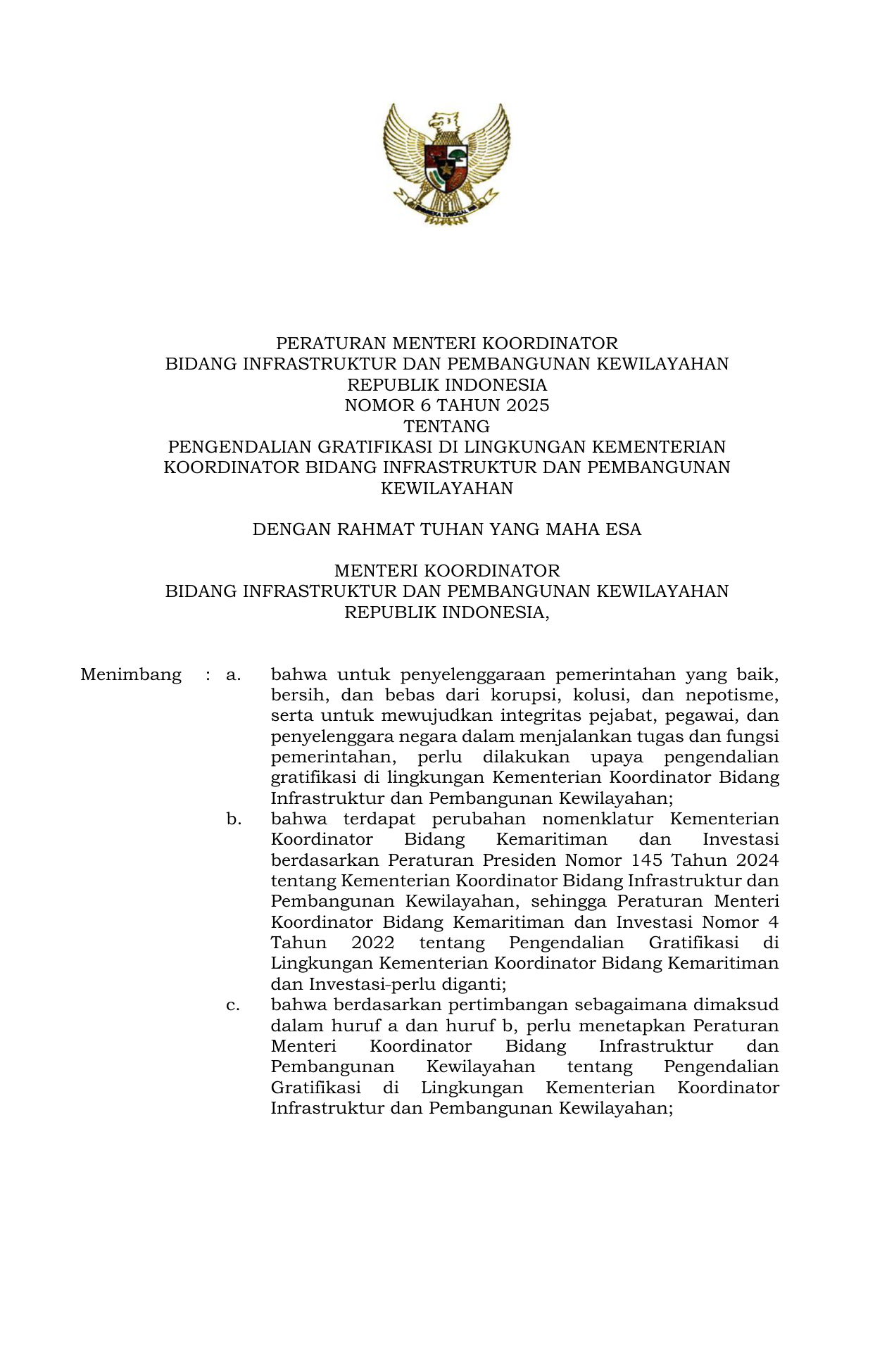 PERMEN Nomor 06 Tahun 2025 | Peraturan Menteri Nomor 06 Tahun 2025 tentang Pengendalian Gratifikasi di Lingkungan Kementerian Koordinator Infrastruktur dan Pembangunan Kewilayahan