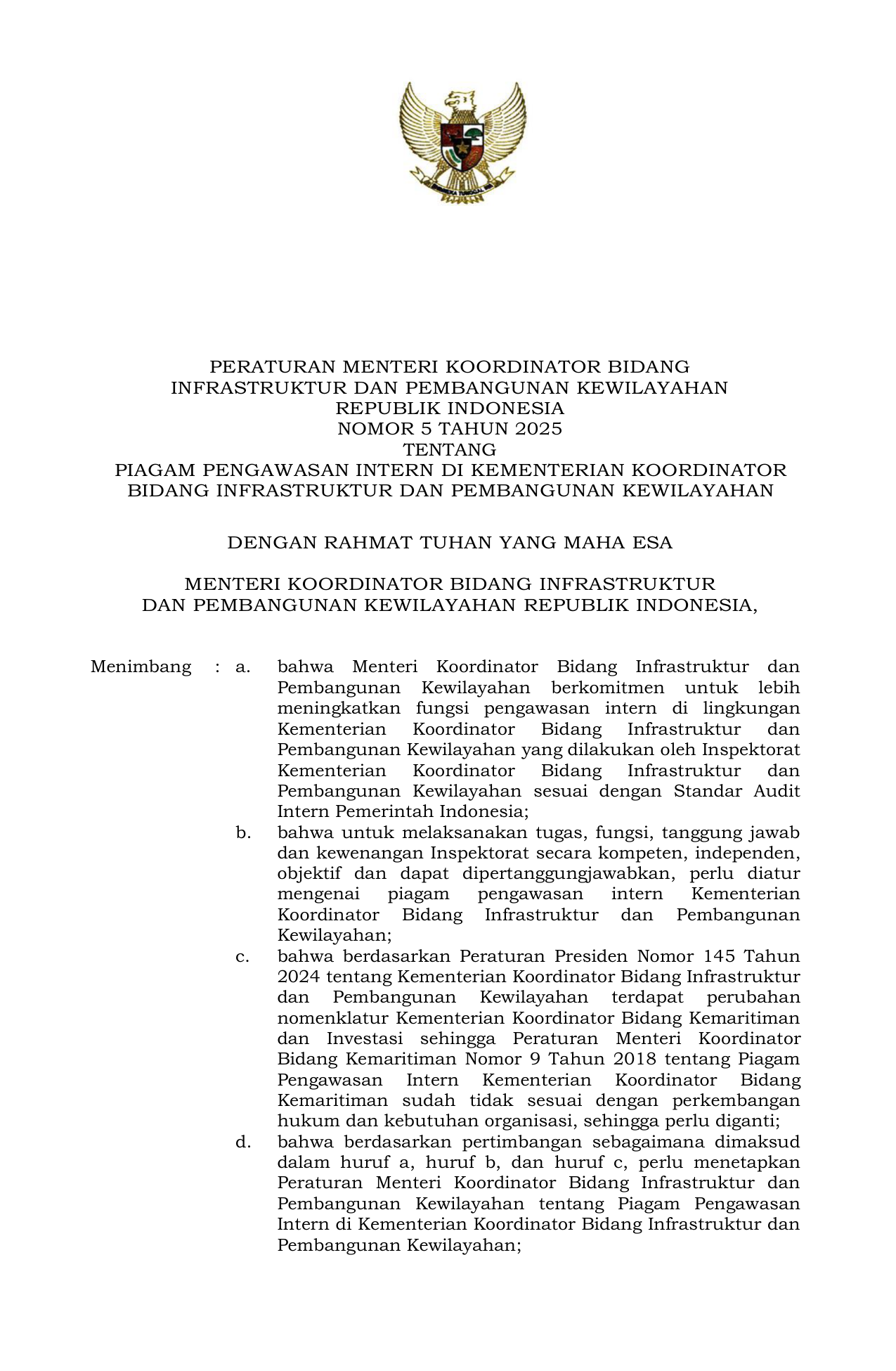 PERMEN Nomor 5 Tahun 2025 | Peraturan Menteri Nomor 5 Tahun 2025 tentang Piagam Pengawasan Intern Kementerian Koordinator Bidang Infrastruktur dan Pembangunan Kewilayahan