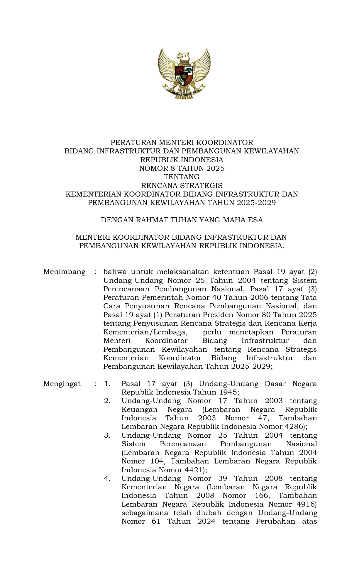 BIDANG INFRASTRUKTUR DAN PEMBANGUNAN KEWILAYAHAN REPUBLIK INDONESIA NOMOR 8 TAHUN 2025 TENTANG RENCANA STRATEGIS KEMENTERIAN KOORDINATOR BIDANG INFRASTRUKTUR DAN PEMBANGUNAN KEWILAYAHAN TAHUN 2025-2029