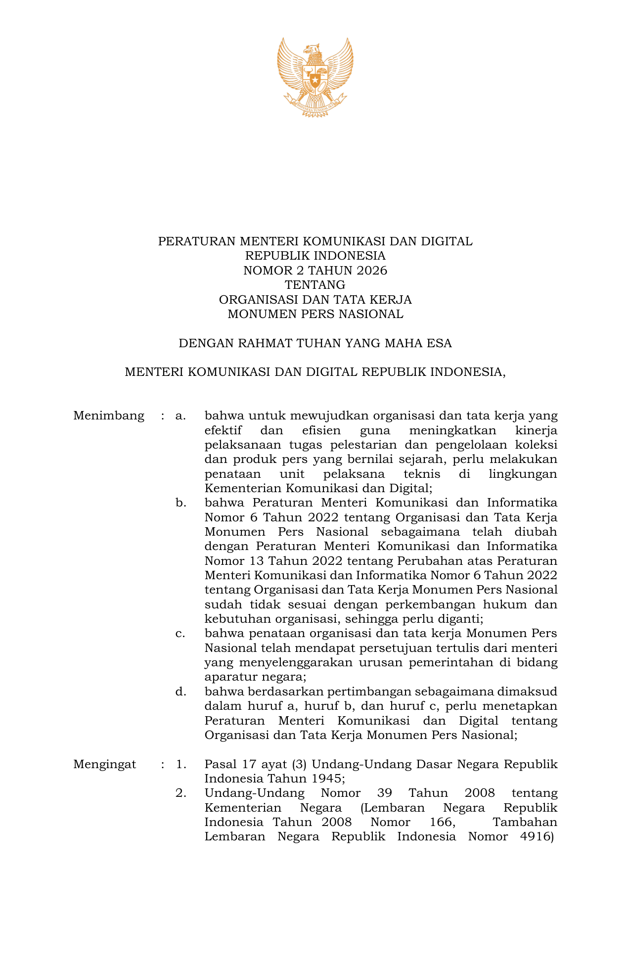 PERMEN Nomor 2 Tahun 2026 | Peraturan Menteri Nomor 2 Tahun 2026 tentang Organisasi dan Tata Kerja Monumen Pers Nasional